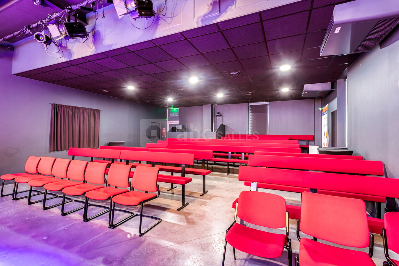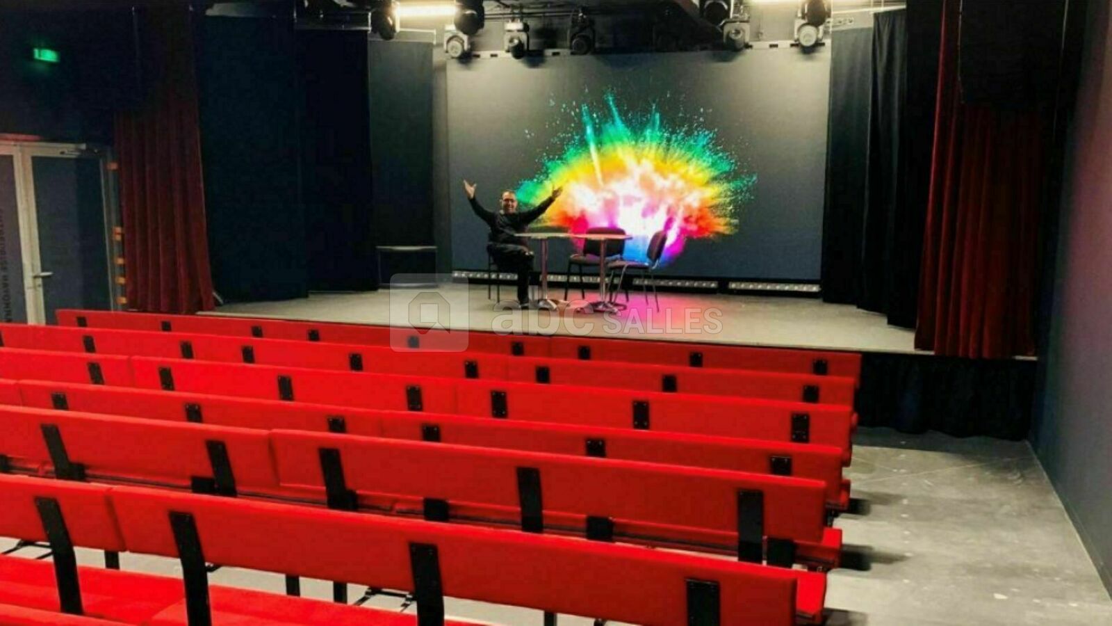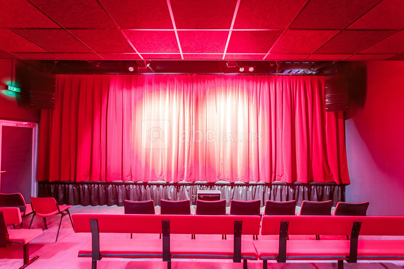 Ambiance théâtre parisien avec des outils digne d'une grande salle de conférence. Régie pro, grand écran tout en gardant l'esprit théâtre avec de grands rideaux rouge pour plus de magie.