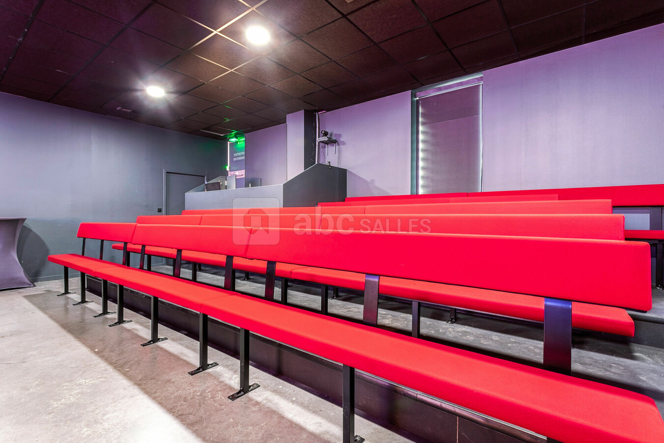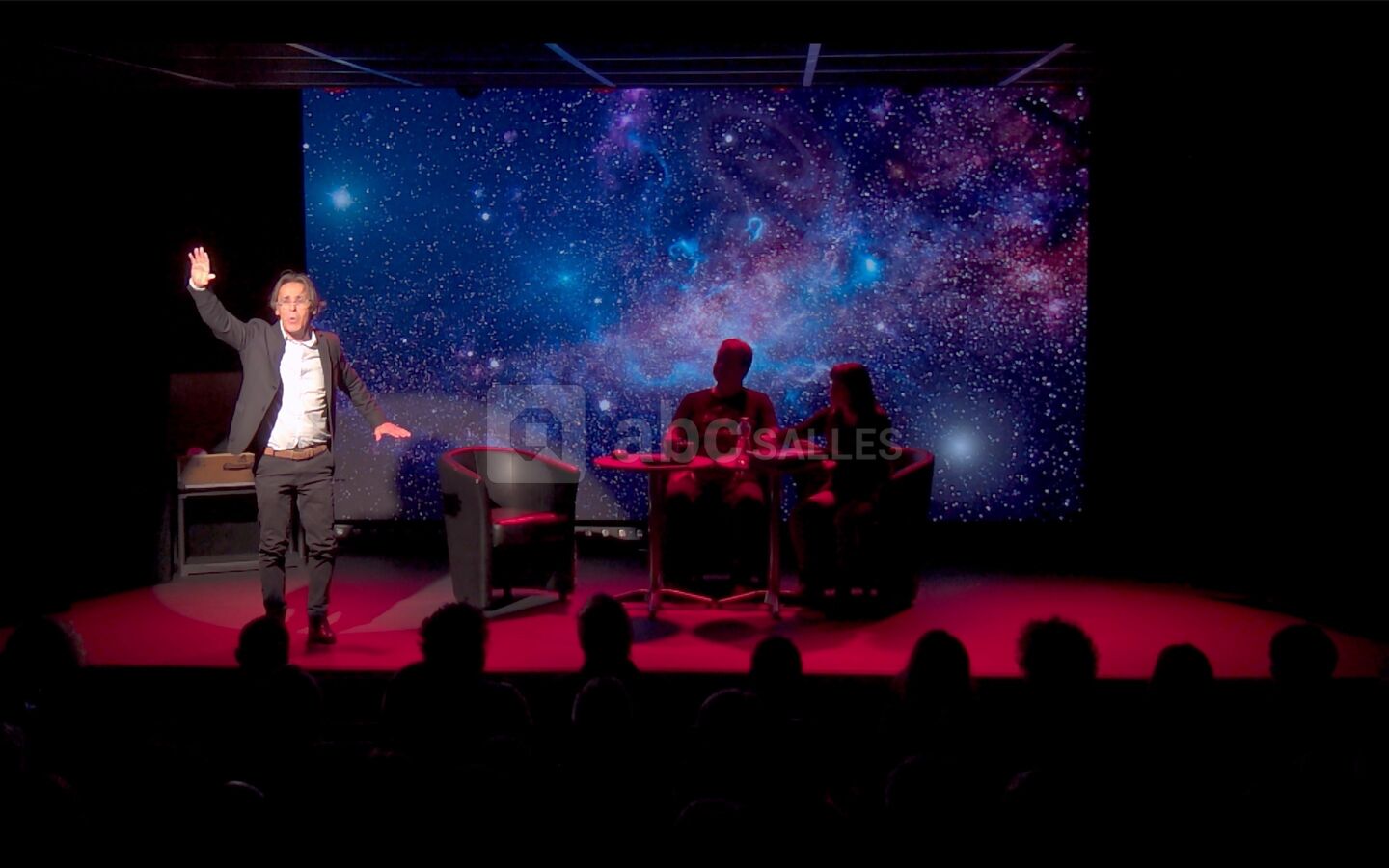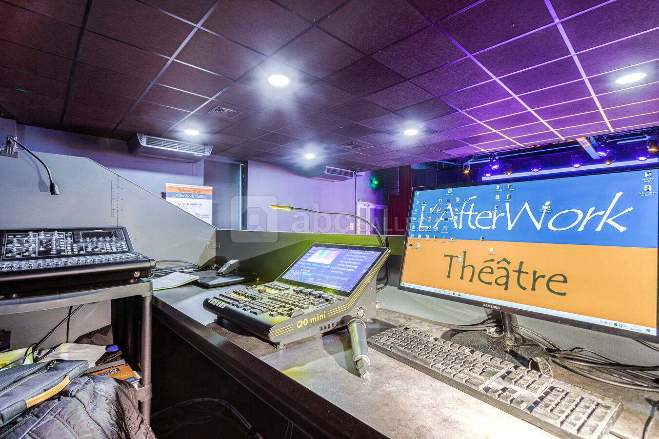 Ambiance théâtre parisien avec des outils digne d'une grande salle de conférence. Régie pro, grand écran tout en gardant l'esprit théâtre avec de grands rideaux rouge pour plus de magie.