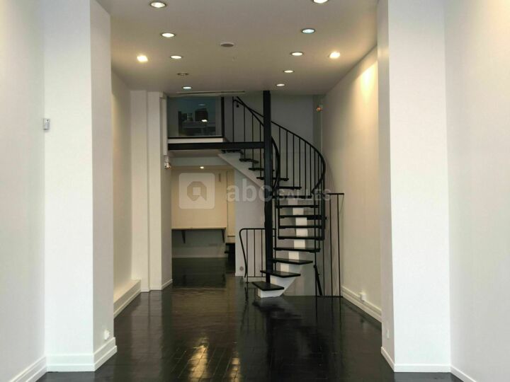 Cet espace de 69m² est un espace sur 2 niveaux, un étage lumineux avec une vitrine, des murs blancs, un carrelage sol noir brillant et une salle aux finitions naturelles qui peut-être modulable en salle de projection ou salle de danse .
