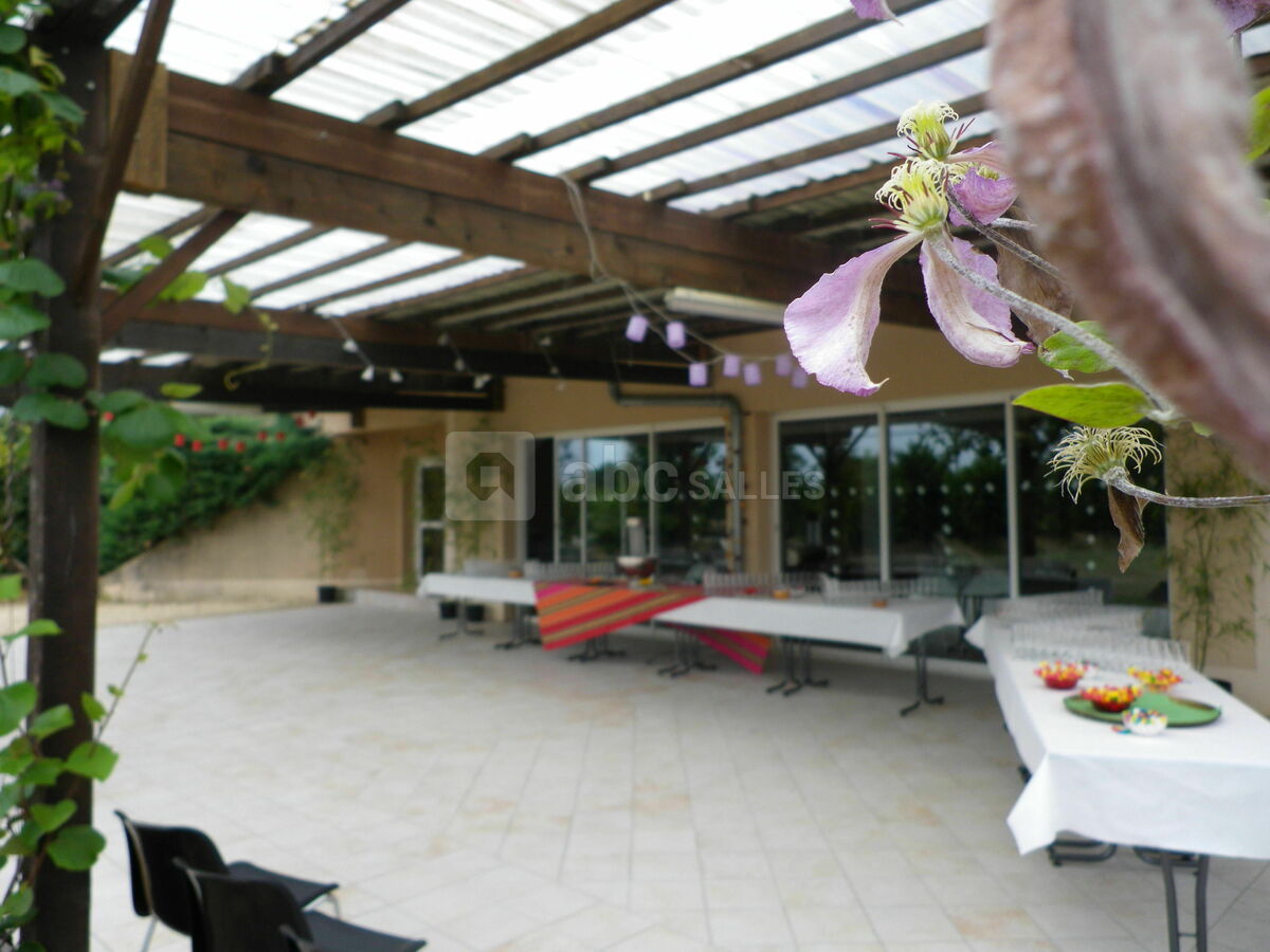 La salle de réception au RDC peut recevoir 300 personnes (250 en configuration dîner assis ou 180/190 avec piste dansante sans retirer les tables). Elle donne sur une terrasse couverte équipée d'une pergola, idéale pour vos apéritifs et déjeuners en extérieur.