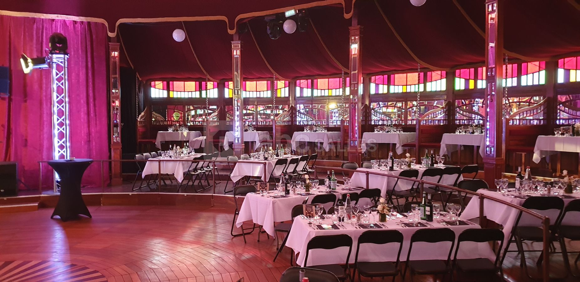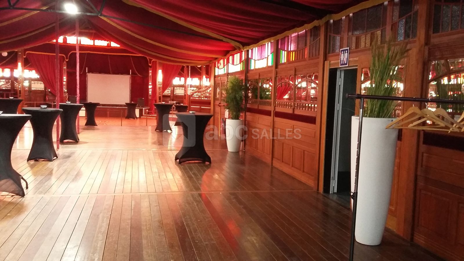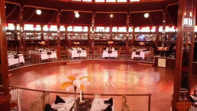 D'une capacité de 1000 personnes maximum, l'espace est organisé autour d'une piste de danse circulaire, en parquet de marqueterie de bois précieux, sur lequel 500 personnes peuvent danser.