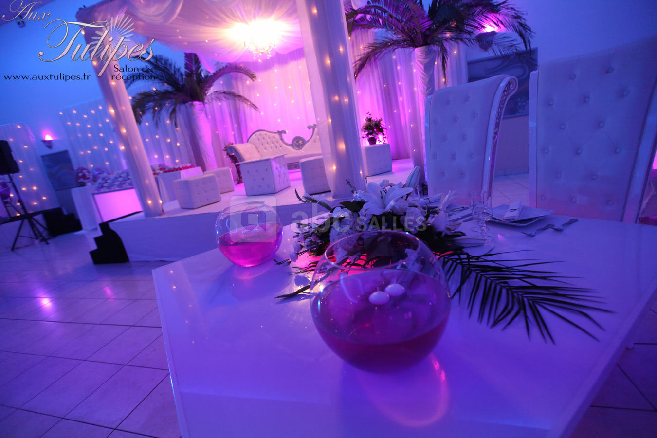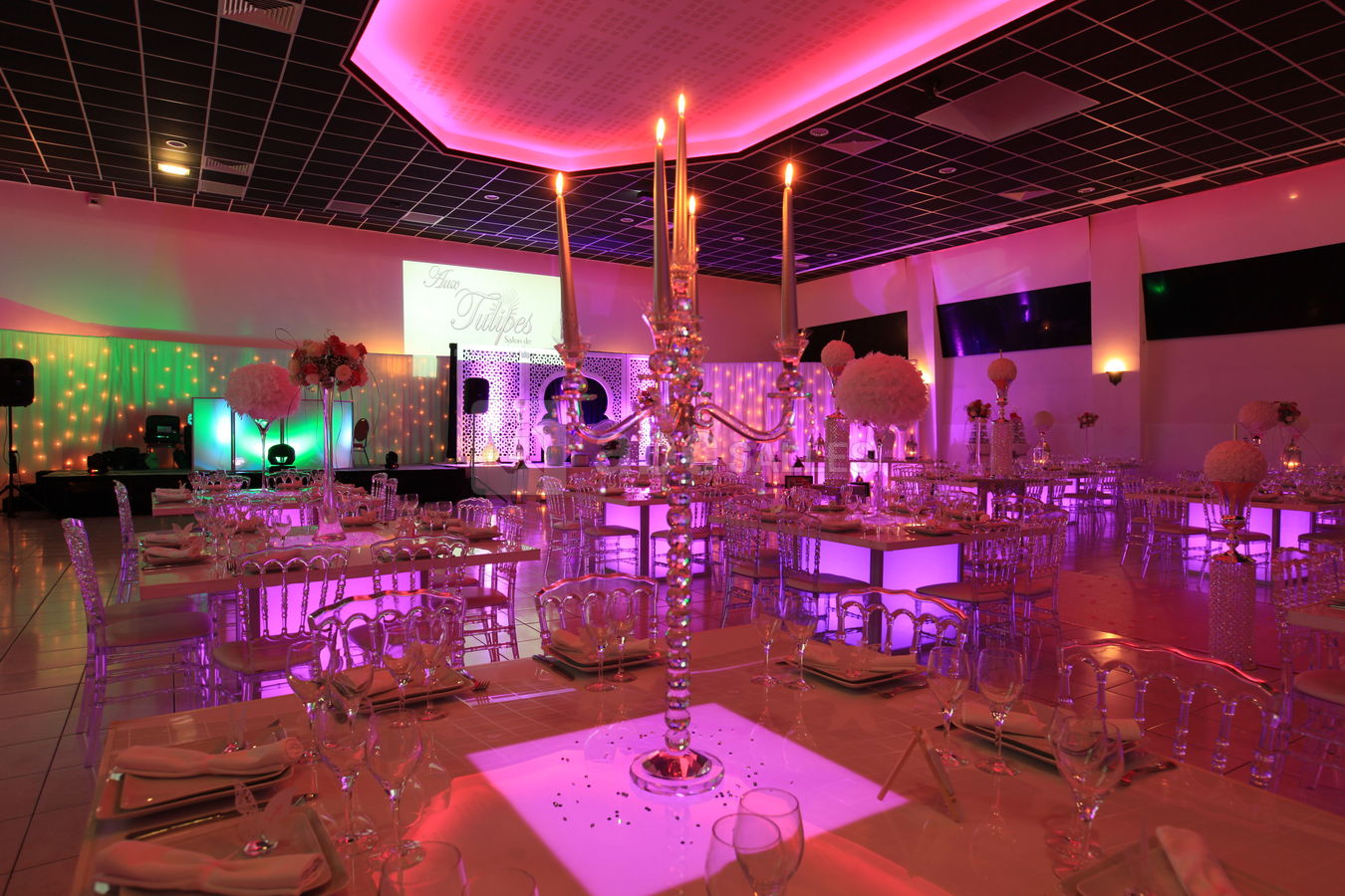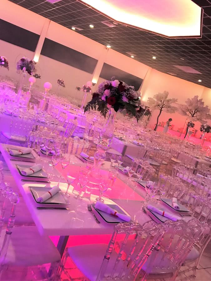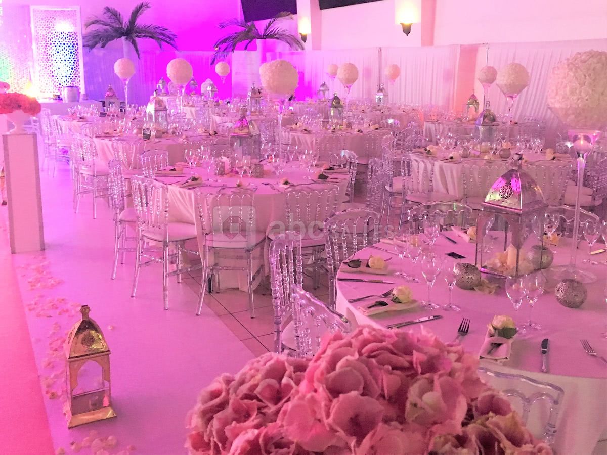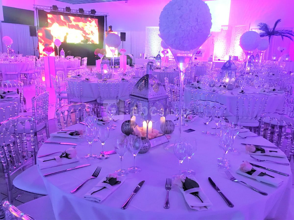 Décoration personnalisable : allée des mariés, mobilier classique ou moderne, centres de table, table d'honneur, décor des mariés, mobilier lumineux, compositions florales, coin photo...