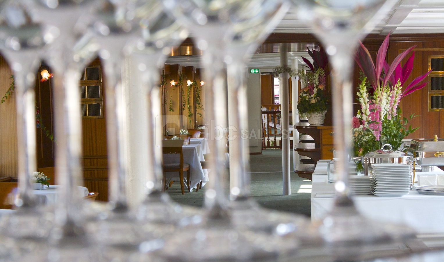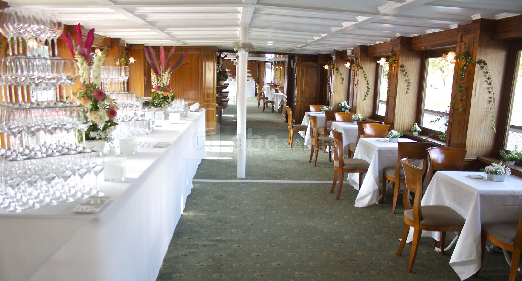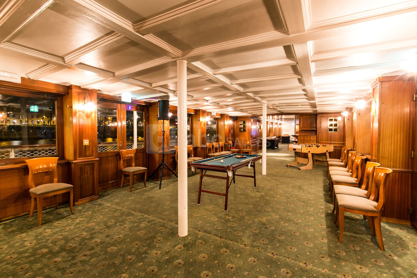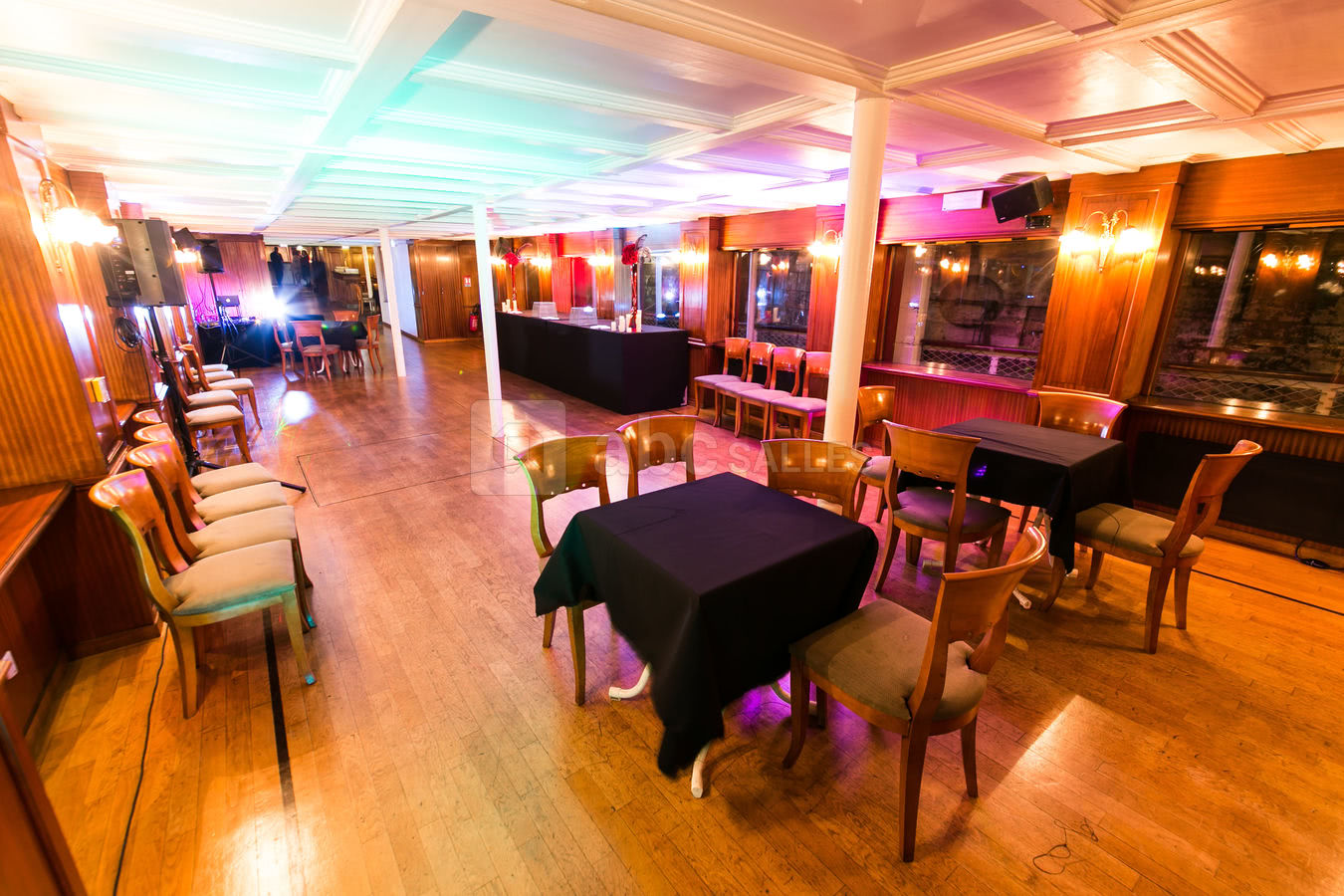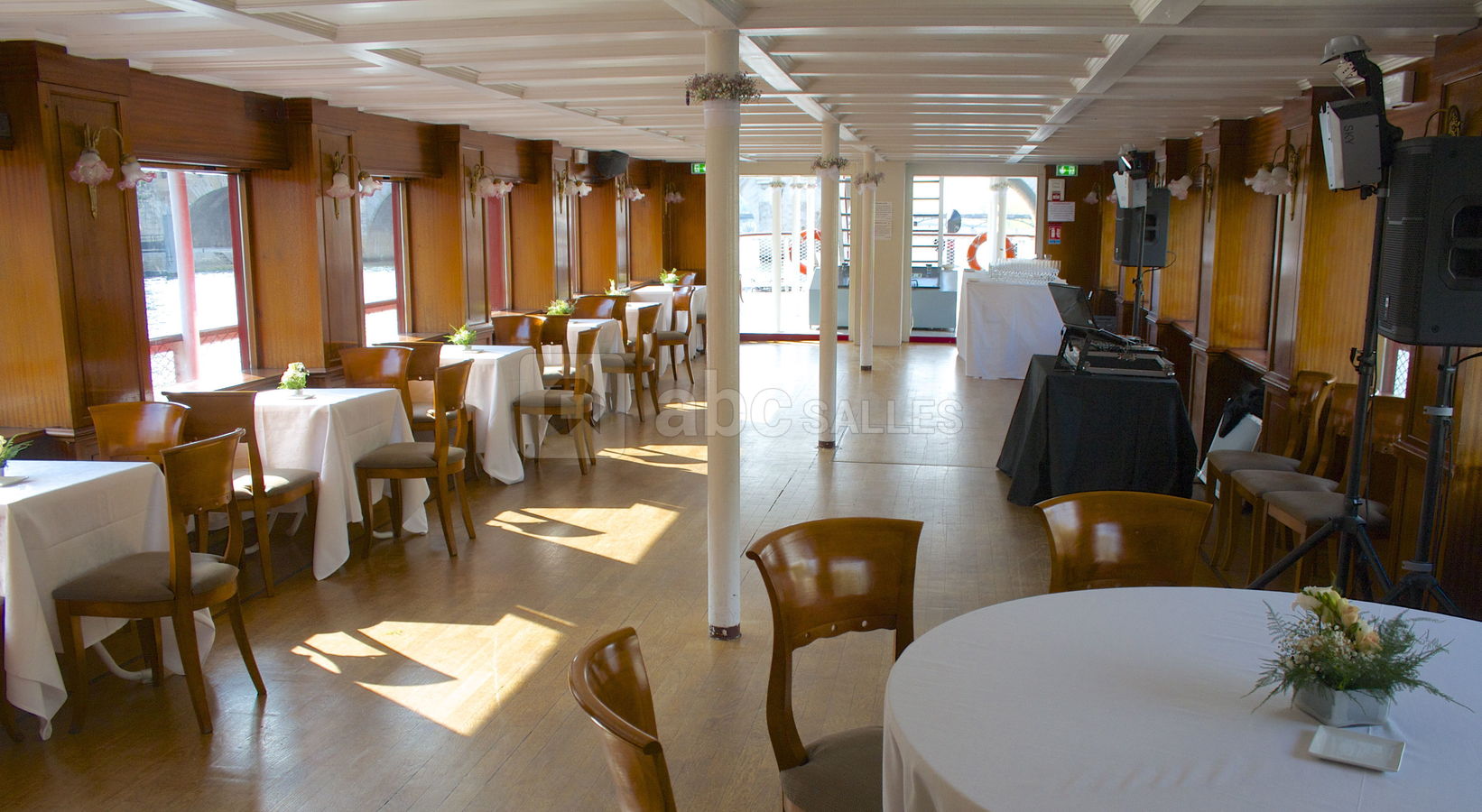 Son pont supérieur moquetté vous invite pour vos réceptions privatives ou professionnelles et son pont principal tout en parquet avec grandes baies vitrées vous reçoit pour vos séminaires, vos présentations de produits, vos soirées dansantes....