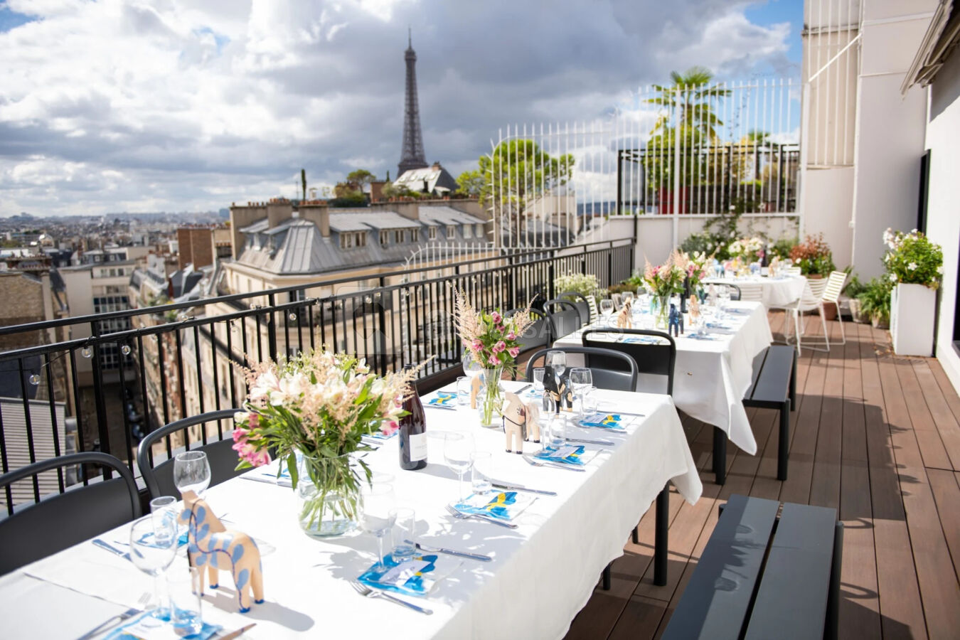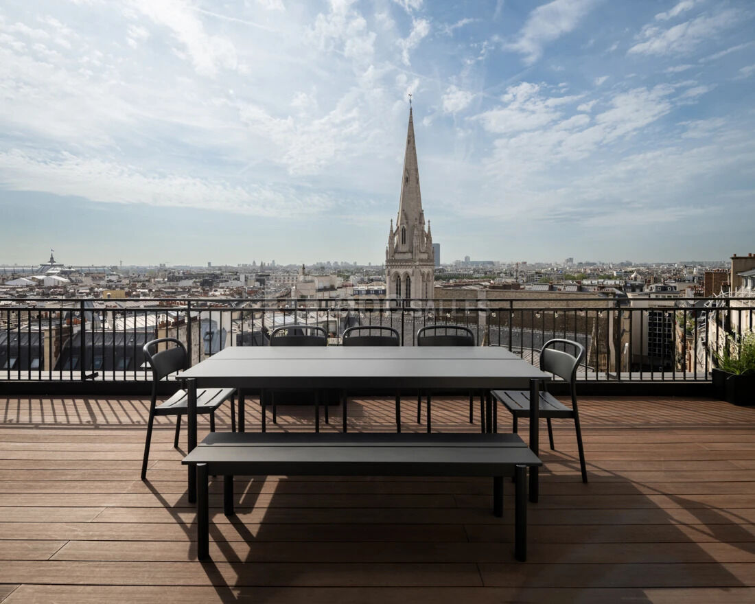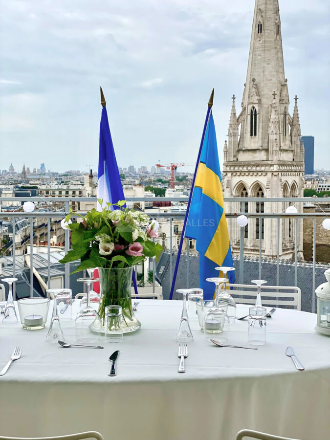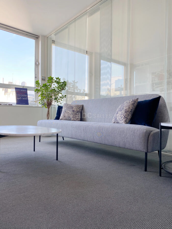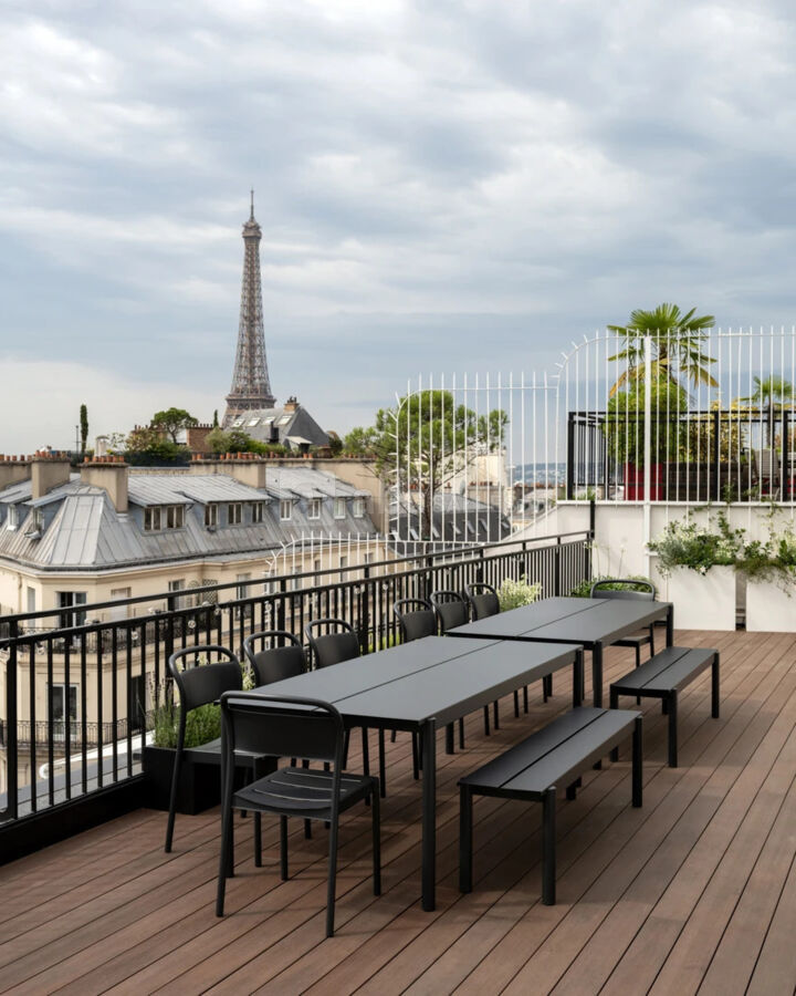 Le neuvième étage, avec terrasse privée et vue exceptionnelle sur le 8e arrondissement de Paris, est devenu la vitrine de la Suède sur la capitale. La salle de conférence est équipée du mobilier design Kinnarps, Ikea, et Adea et la terrasse est également imprégnée d’une tonalité suédoise.