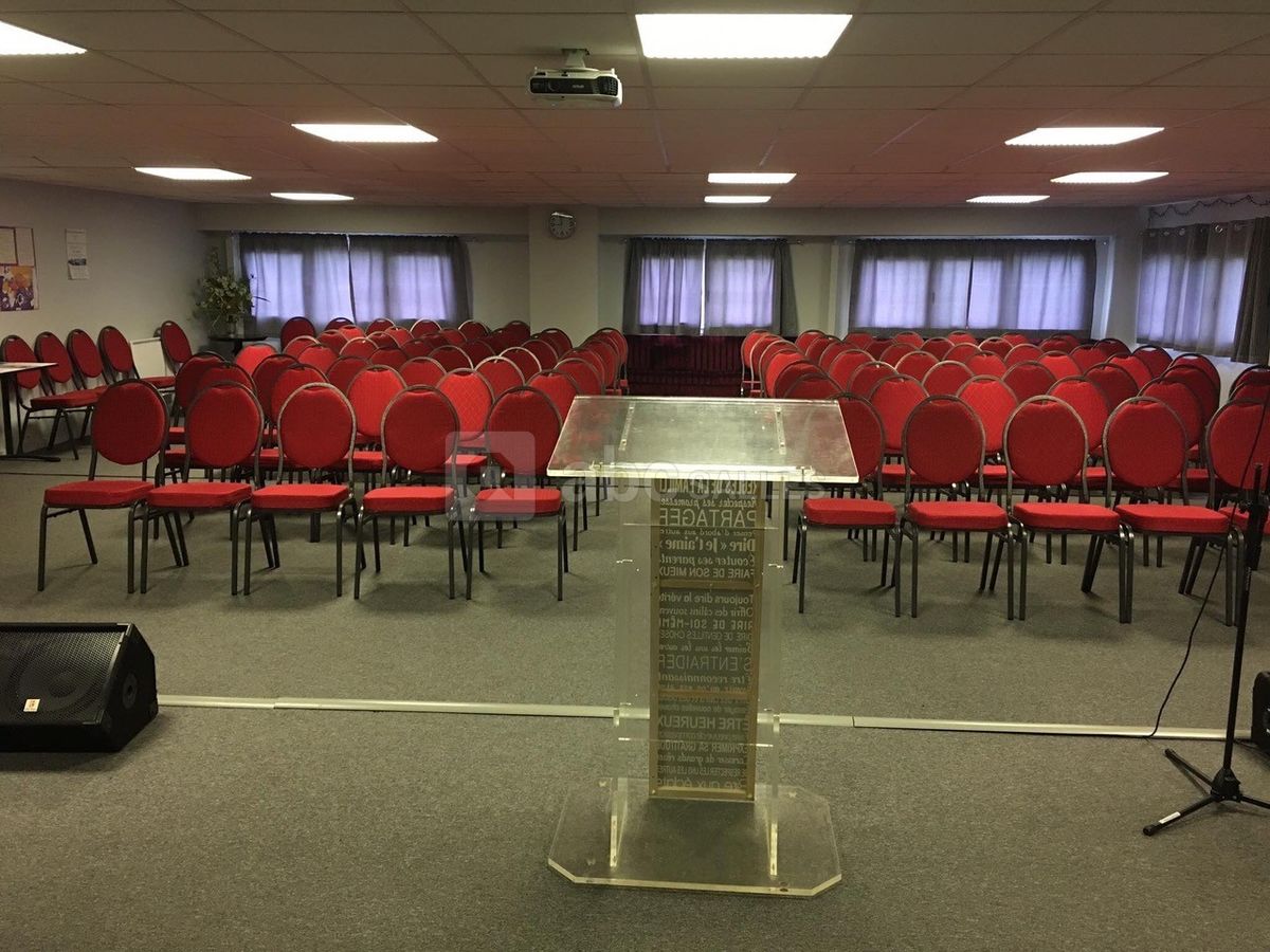 Concernant nos salles, la plus grande, la salle de conférence mesurant 125m² vous y retrouverez de la moquette, tout un équipement de grand confort (chaises en velours confortables) et aussi du matériel de sonorisation (projecteur, micro, écran, sono, pupitre) !