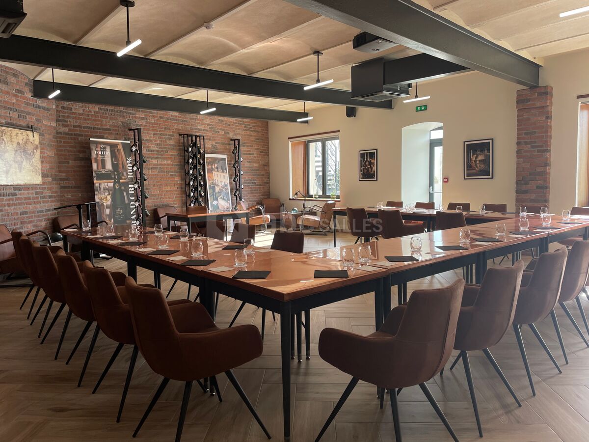 Le confort n’est pas en reste : la salle couvre 95 m², est équipée de fauteuils en cuir, de la climatisation, de rideaux occultants, espace bar etc. Les sanitaires attenants la rendre totalement indépendante.