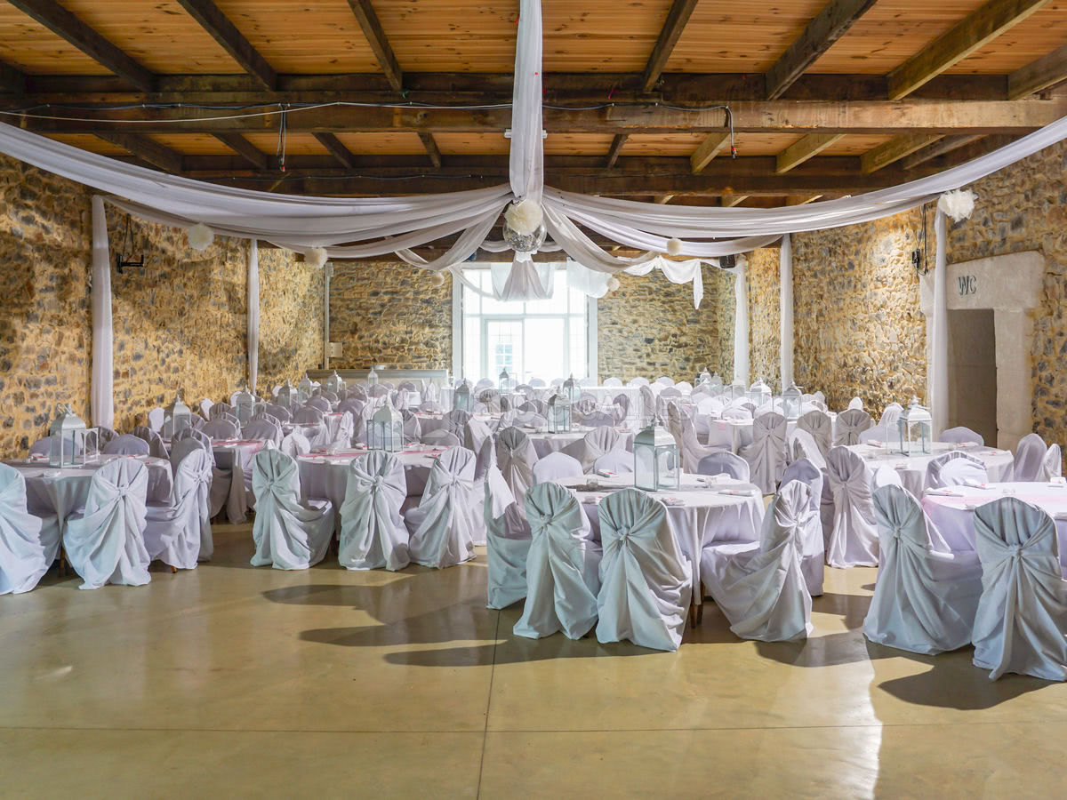 Une salle de 200 places tout en pierre apparentes équipée d'une scène, table ronde, rectangulaire et chaises banquet, un espace traiteur.