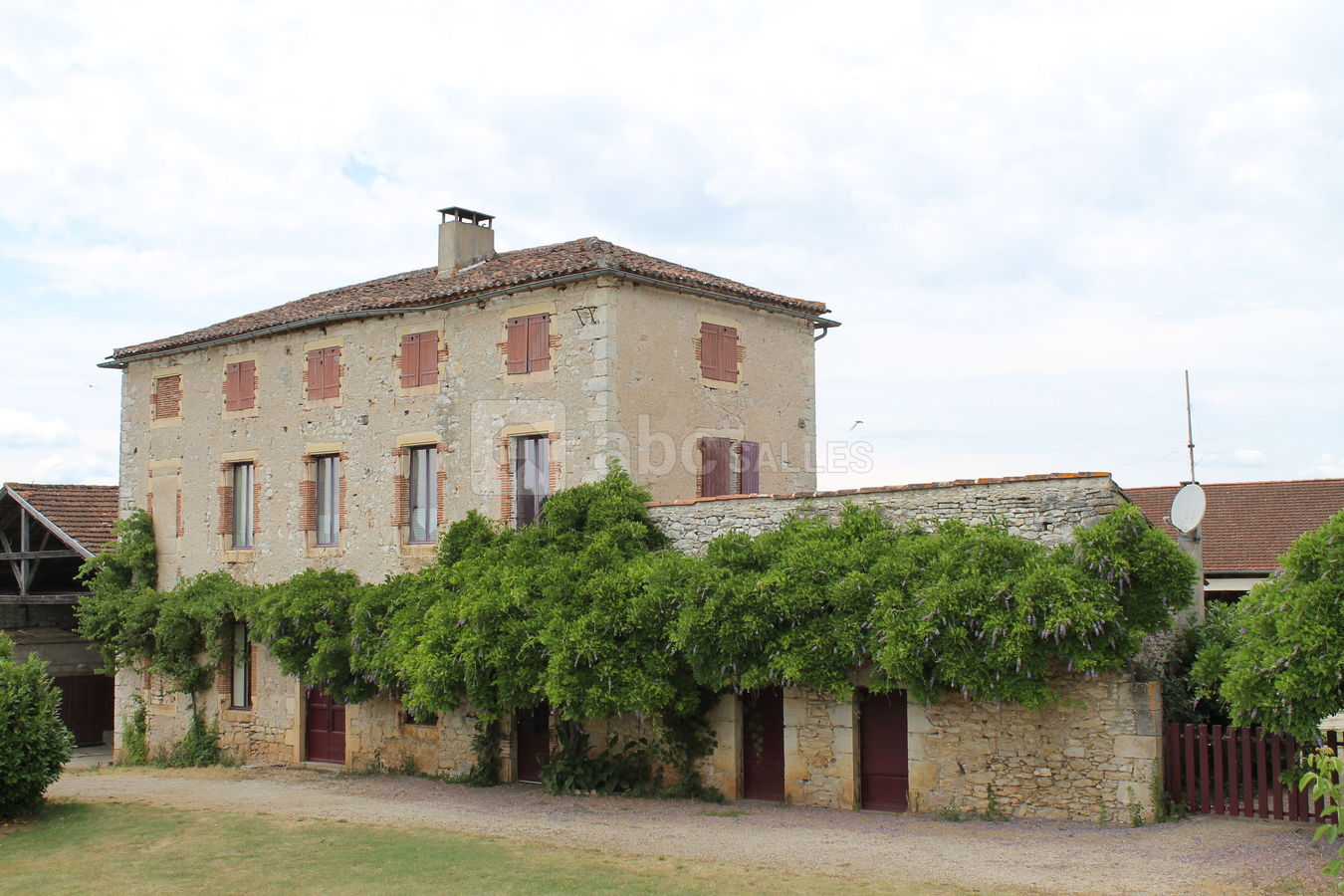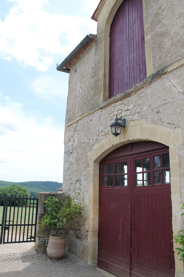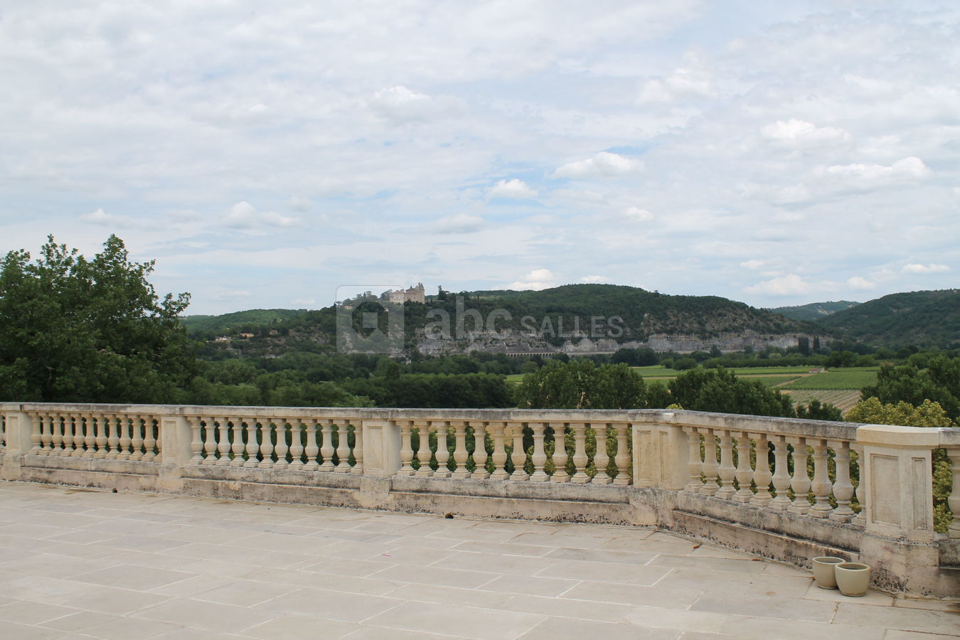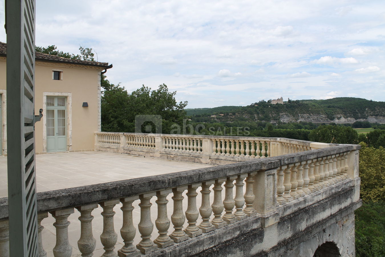 Terrasse : Dallée en pierres d’une grandeur de 120 m², exposée Est avec vue sur le Lot et sa vallée. Véritable trait d’union de l’ensemble des salons.