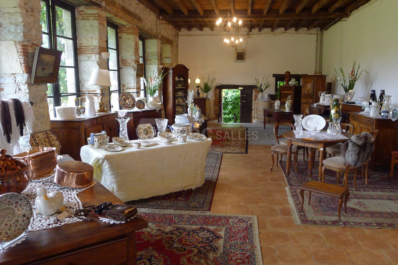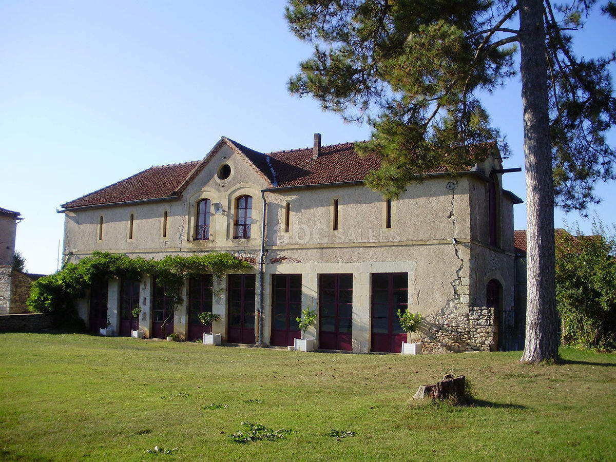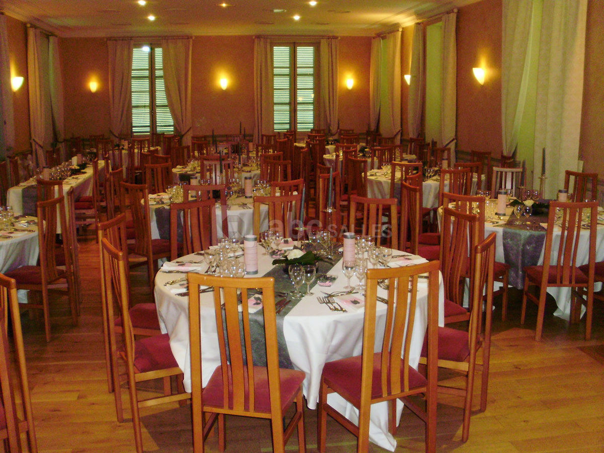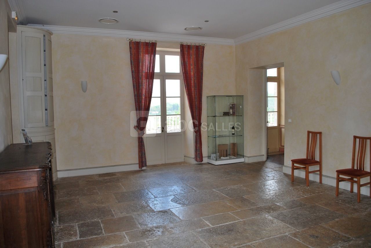Grande salle de réception : Vous accédez directement par le perron à cette salle de 135 m² avec un parquet en chêne pouvant être aménagée en tables rondes de 10 personnes soit en tables de banquet (accueil jusqu’à 160 personnes) Vue à l’Est sur le Lot et à l’Ouest sur le parc et le vignoble. Un office de 10 m² dessert cette pièce.