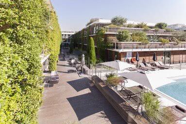 Idéalement situé sur le Parvis de l’Hôtel de Ville de Montpellier, conçu par les célèbres architectes Jean Nouvel et François Fontès, le Courtyard Montpellier se trouve au cœur du quartier Port Marianne à proximité des principaux centres d’intérêts de la ville. L’Ecusson, centre historique de Montpellier, le Parc des Expositions, le musée Fabre et autres sites incontournables de la ville sont accessibles par les trois lignes de tramway desservant l’établissement, dernier né des hôtels 4 étoiles de Montpellier. Bénéficiant d’une situation privilégiée et d’un parking privatif souterrain, le Courtyard Montpellier est un acteur de référence pour les voyageurs en quête de confort et de prestations de standing pendant leur séjour. Nos chambres spacieuses et lumineuses disposent d'une connexion WiFi gratuite, et l’accès à notre salle de Fitness est ouvert librement tous les jours 24heures sur 24. L’établissement offre également une piscine extérieure chauffée (de mai à septembre) et un solarium avec une vue surplombant le bassin Jacques Cœur. Le bistro méditerranéen Oleo Pazzo vous propose une cuisine méditerranéenne revisitée autour de produits de saison dans un cadre raffiné, idéal aussi bien pour vos déjeuners d’affaires que pour vos repas en famille. Vous pourrez également vous détendre ou travailler à votre aise dans le business corner équipé d’ordinateurs de bureau de dernière technologie. Nos espaces publics sont dotés de l'accès Internet sans fil, de stations multimédias et de grands téléviseurs haute définition. Notre nouvelle borne interactive GoBoard vous permettra de consulter les résultats sportifs, la météo, les actualités et bien plus encore pour planifier au mieux vos visites à Montpellier et dans la région du Languedoc-Roussillon.