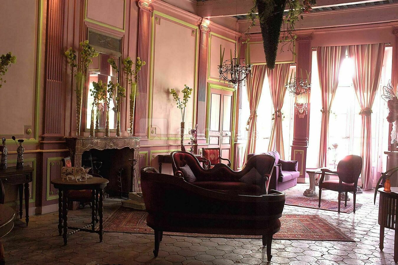 Quatre grands salons en enfilade à la décoration baroque et colorée accueillent votre séminaire (jusqu’à 20 personnes), votre réception ou votre mariage (jusqu’à 150 personnes assises).