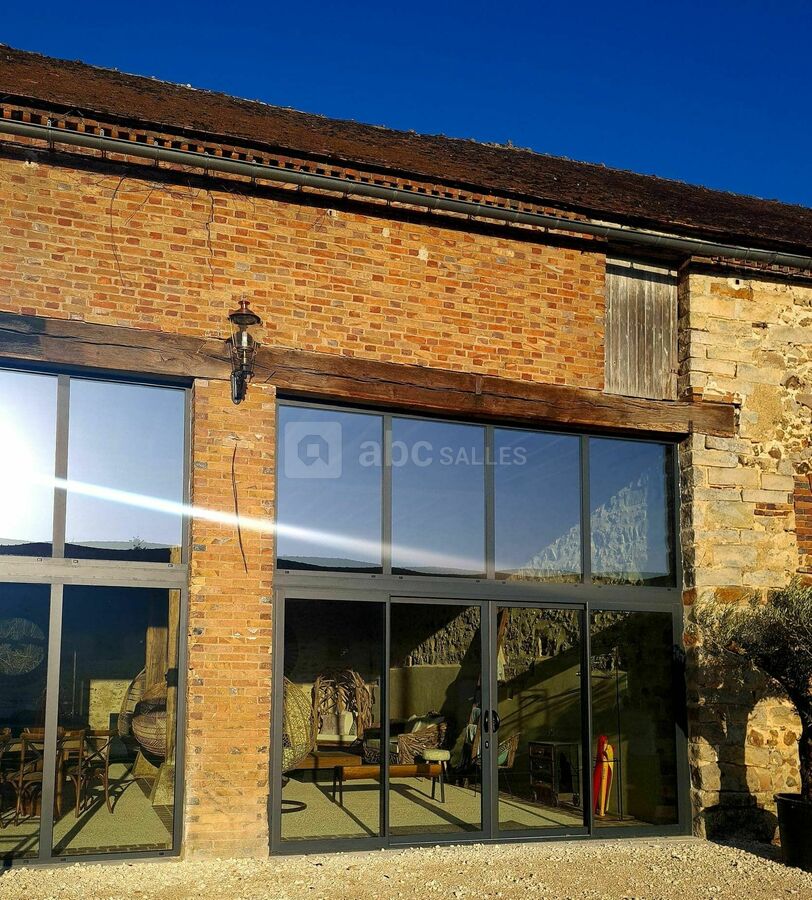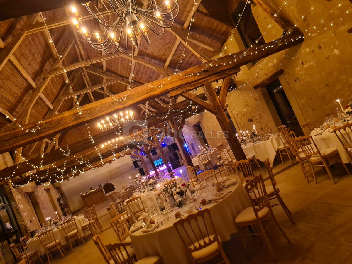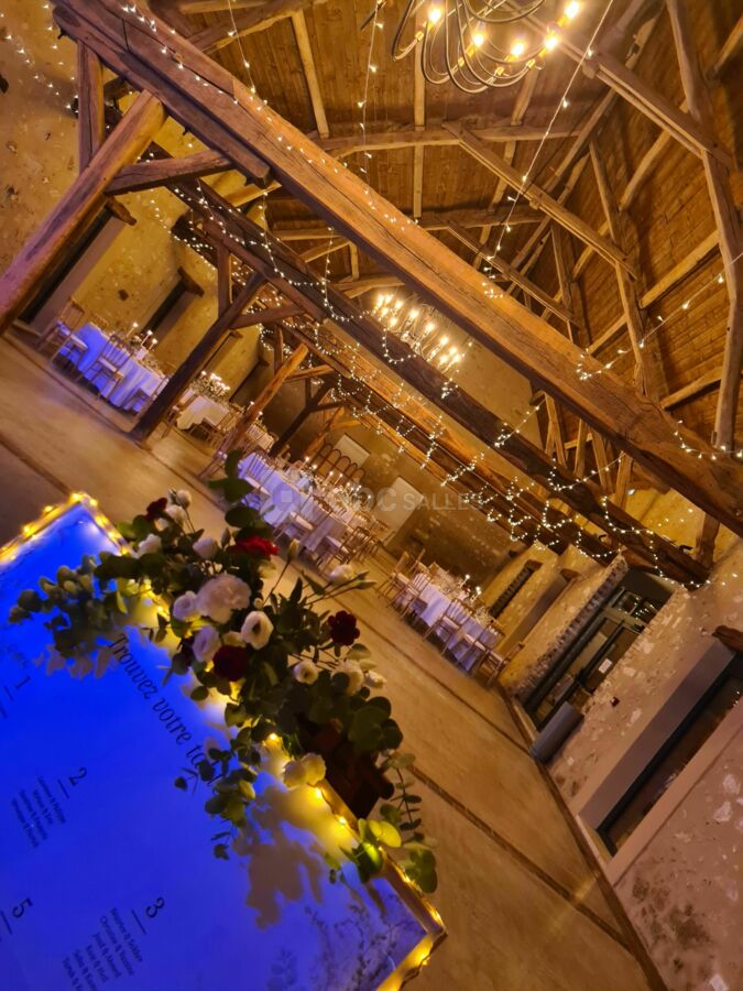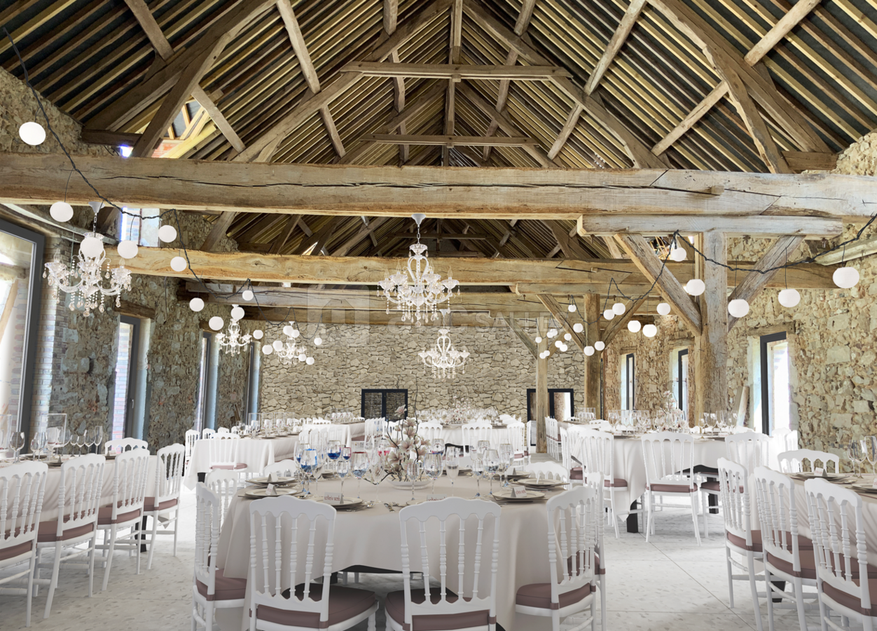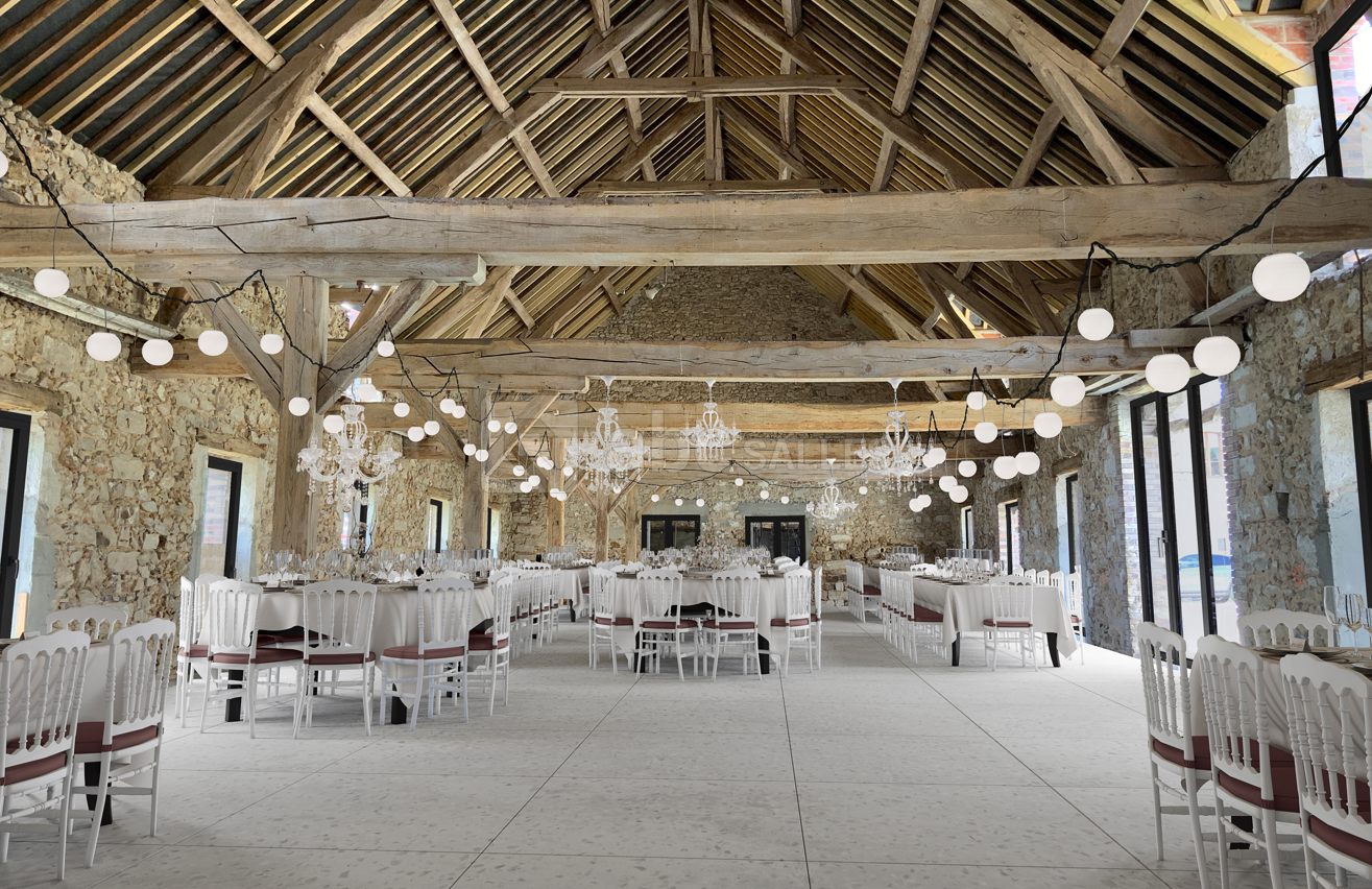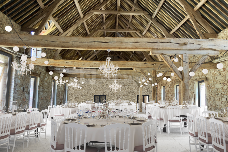 - La salle de réception : D’une superficie de 280 m², cette salle vous offre un très beau volume puisqu’elle est entièrement cathédrale. Murs en pierres, grandes ouvertures sur l’extérieur, plafond cathédrale avec vue sur la superbe charpente, elle allie l’ancien et le moderne. Le mobilier : tables et chaises est compris dans la location. Elle a une capacité de 180 personnes.
