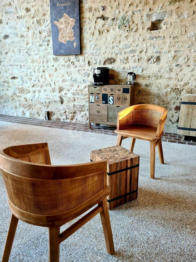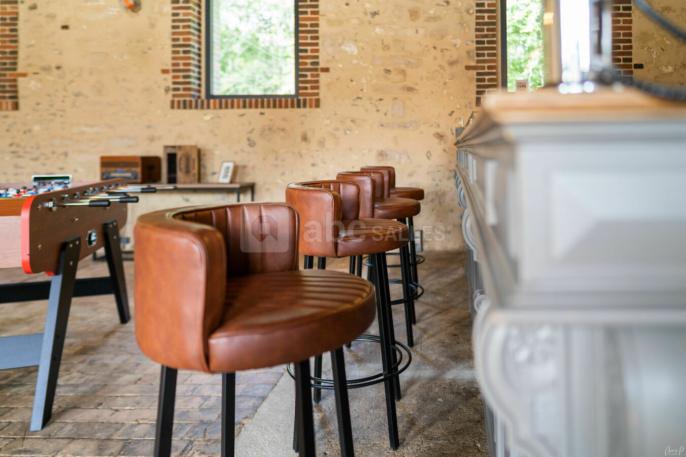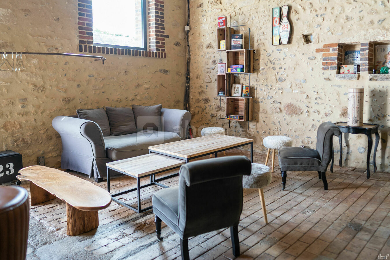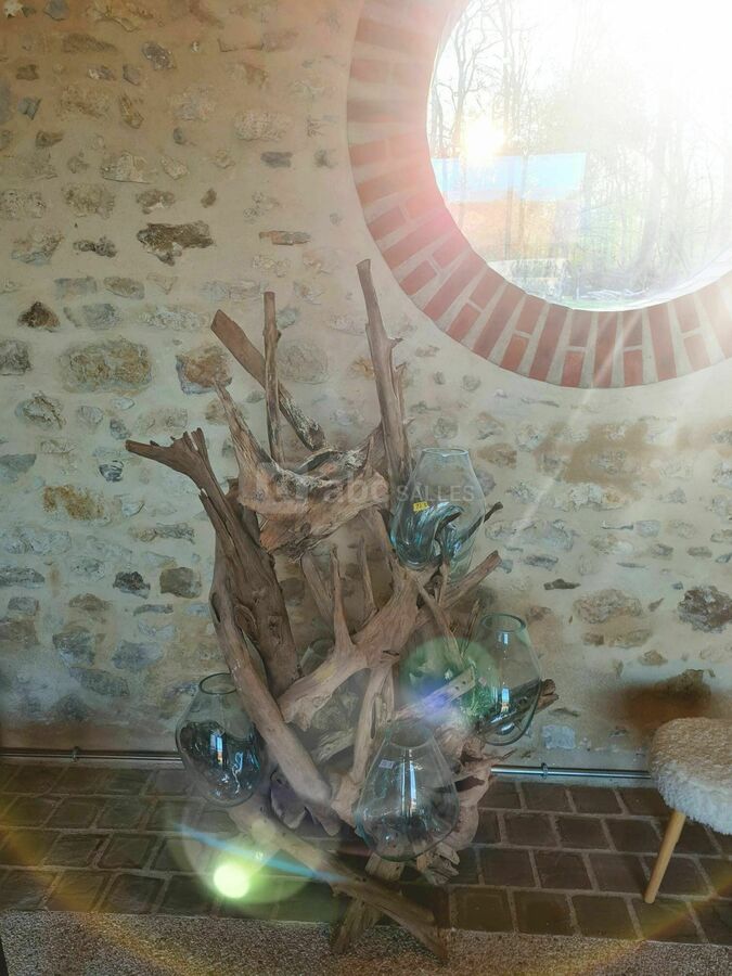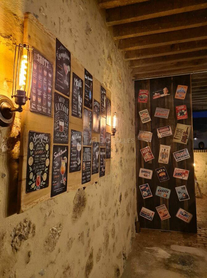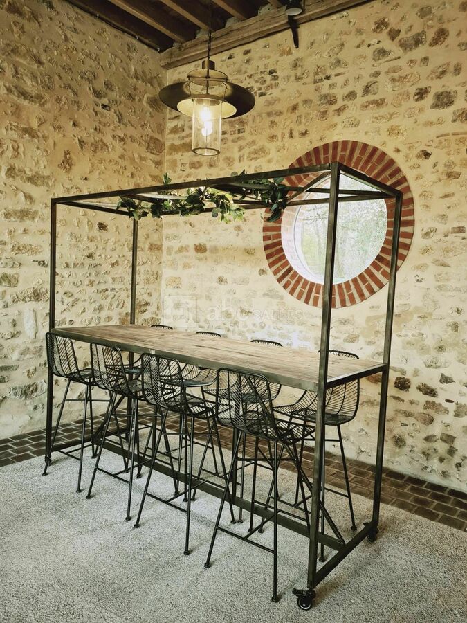 - La salle de réception : D’une superficie de 280 m², cette salle vous offre un très beau volume puisqu’elle est entièrement cathédrale. Murs en pierres, grandes ouvertures sur l’extérieur, plafond cathédrale avec vue sur la superbe charpente, elle allie l’ancien et le moderne. Le mobilier : tables et chaises est compris dans la location. Elle a une capacité de 180 personnes.