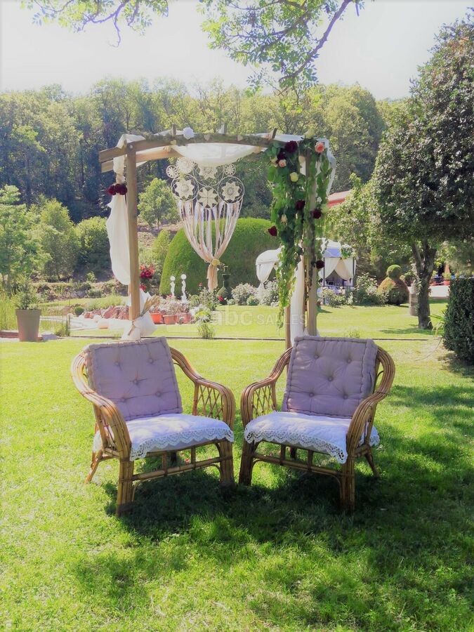 Le Domaine de la Pradat Haute propose la location d'une salle de 135 m² aux installations et prestations de qualité. Décorée selon vos goûts et vos envies elle peut accueillir jusqu’à 85 personnes. 3 tentes Garden Cottage, ainsi qu'un espace extérieur, fleuri, arboré et agrémenté de trois bassins avec jets d'eau, sont à votre disposition.