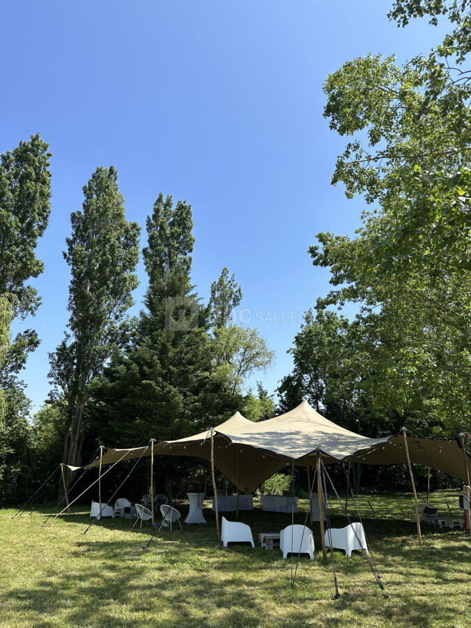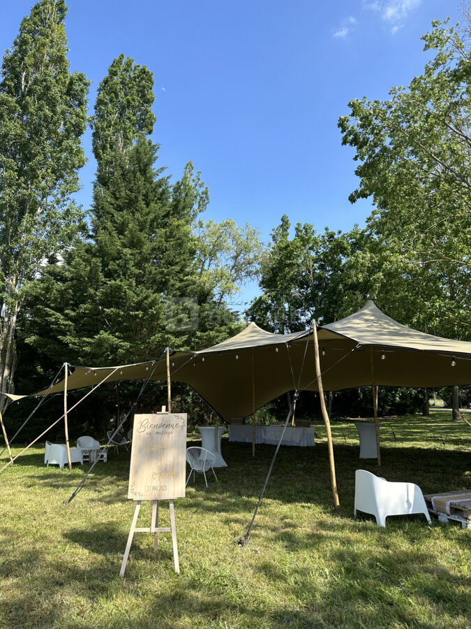La taille du parc nous permet de monter un chapiteau, en supplément, pour vos apéritifs à l’extérieur.