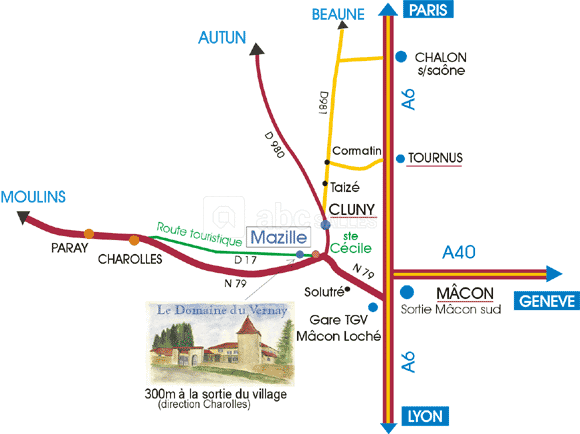 - 7 min. de Cluny - 15 min. de Mâcon - 20 min. de Charolles - 25 min. de Paray - 30 min. de Tournus - 45 min. de Chalon/Saône - 45 min. de Lyon, par autoroute et voie express - 1h 30 min. de Genève, par autoroute et voie express Sortie autoroutes A6, A40 = 15 min.