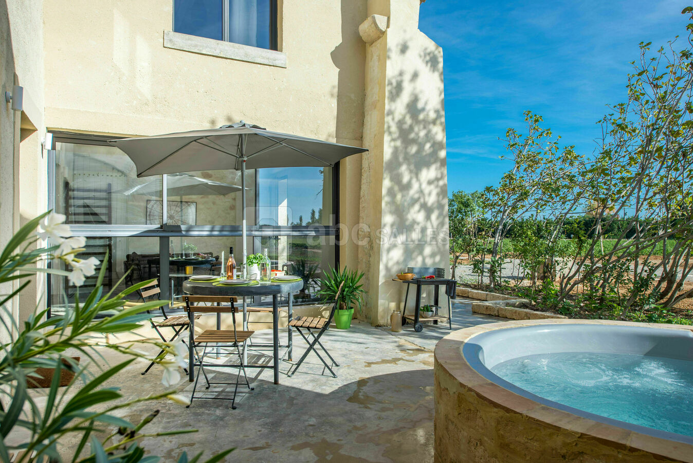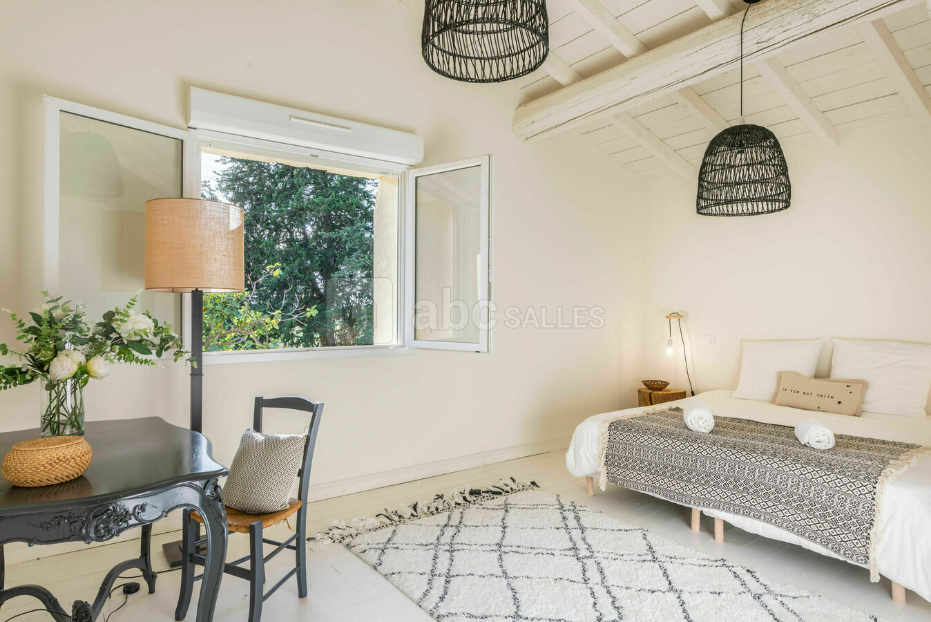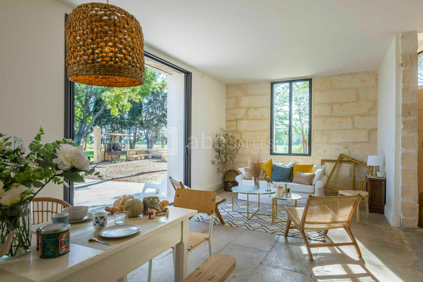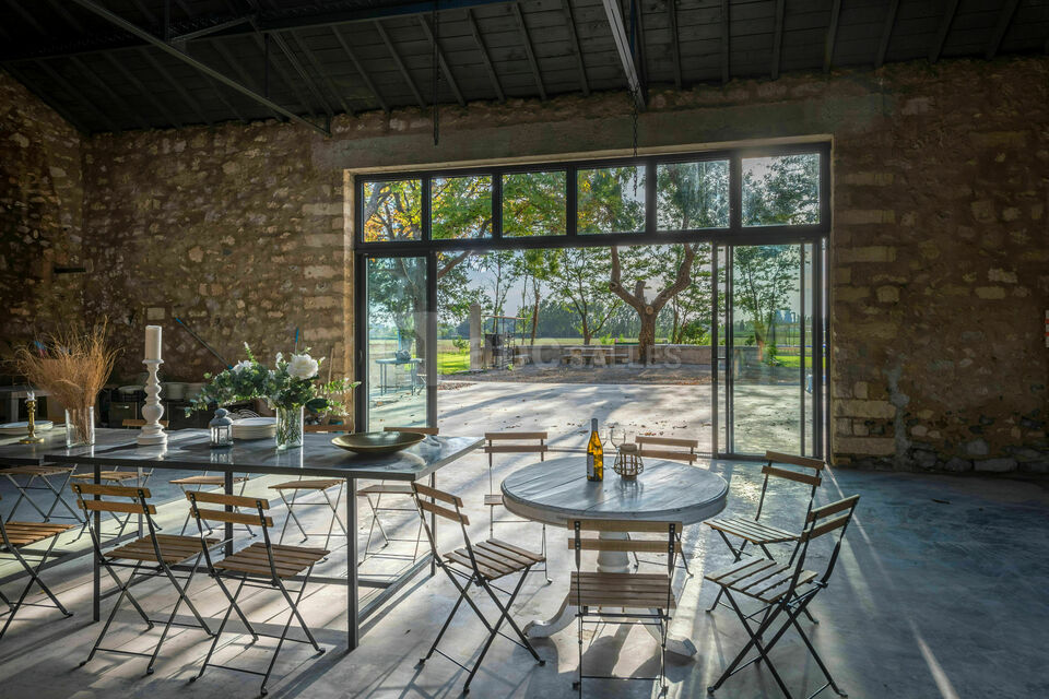 Avec sa grande salle privative et une cour extérieure au cœur d’un vignoble, ce lieu de partage et de convivialité ravira vos invités. Le terrain vous offre un cadre idyllique avec sa piscine, son coin lounge et ses différents espaces de détente.