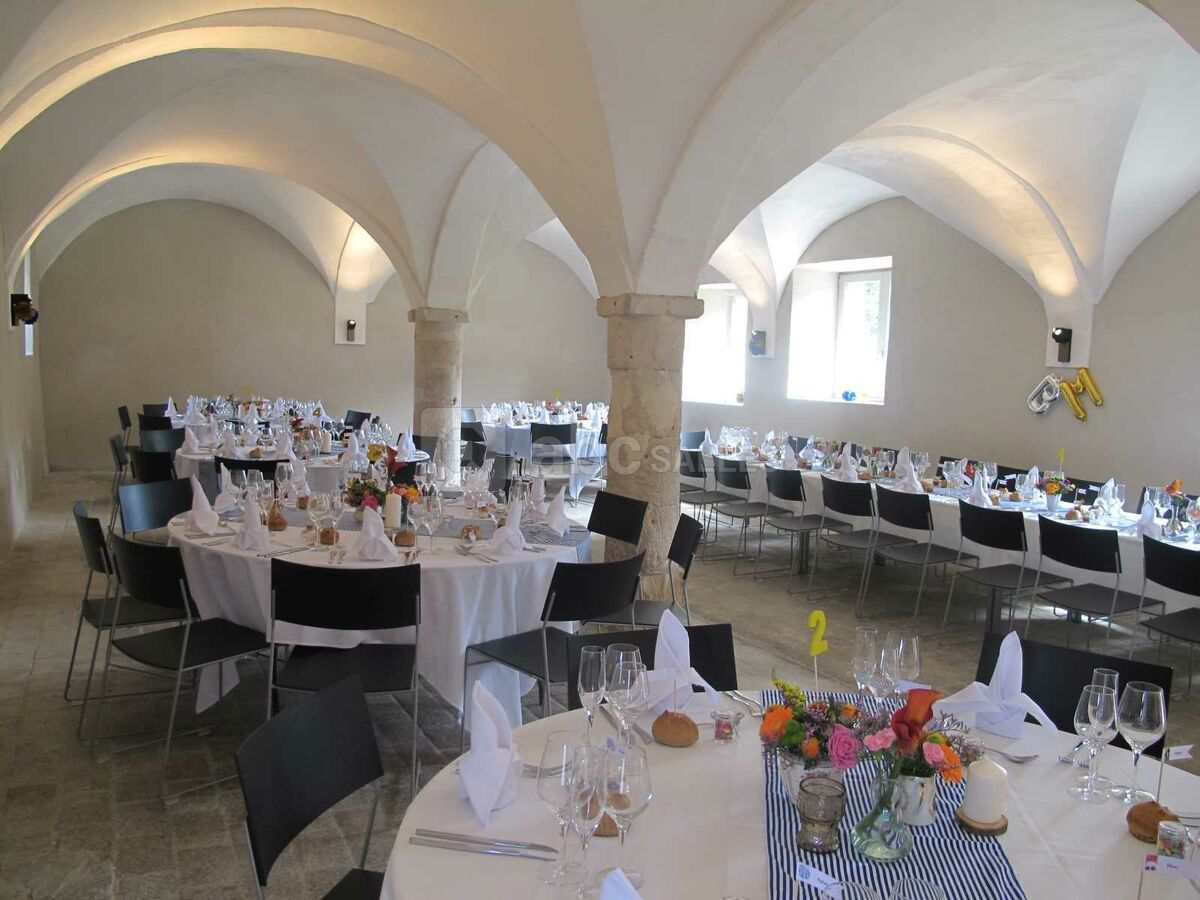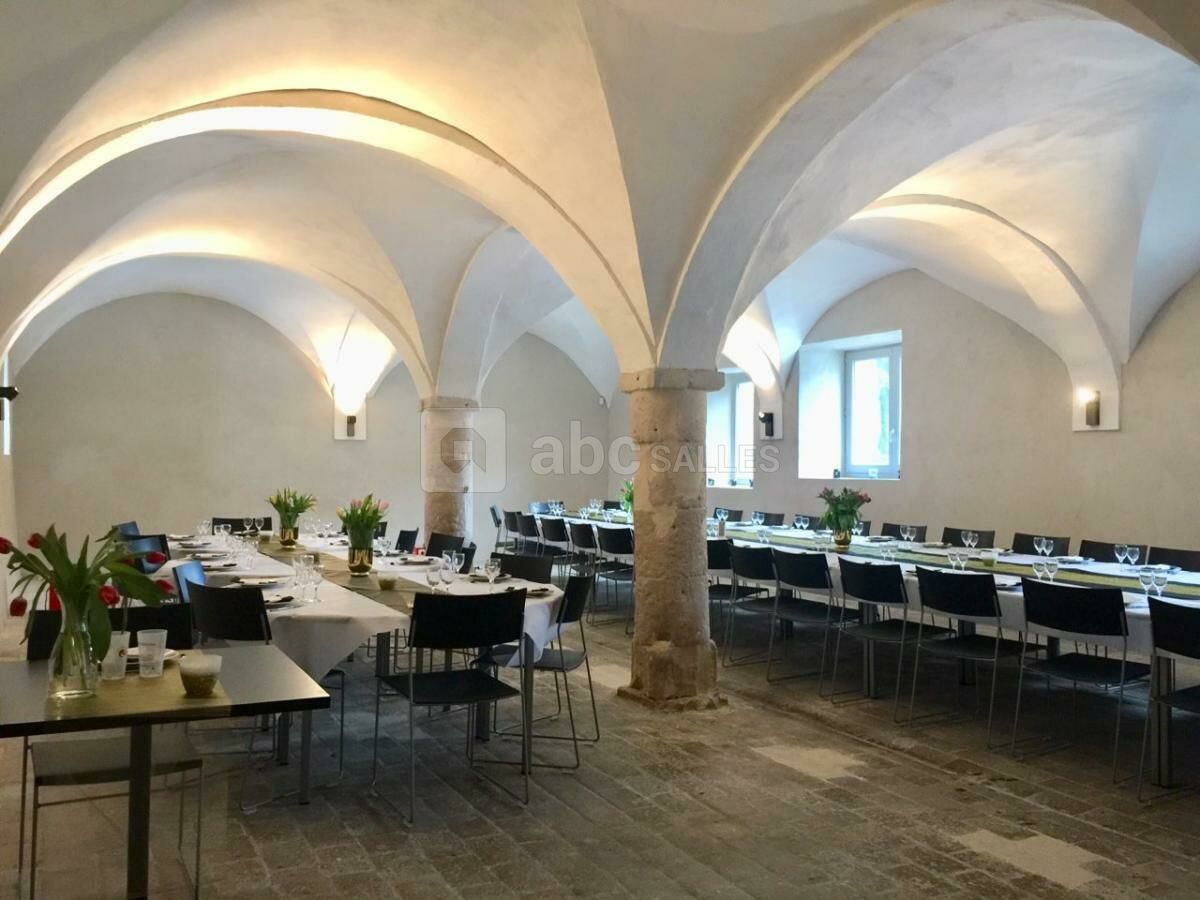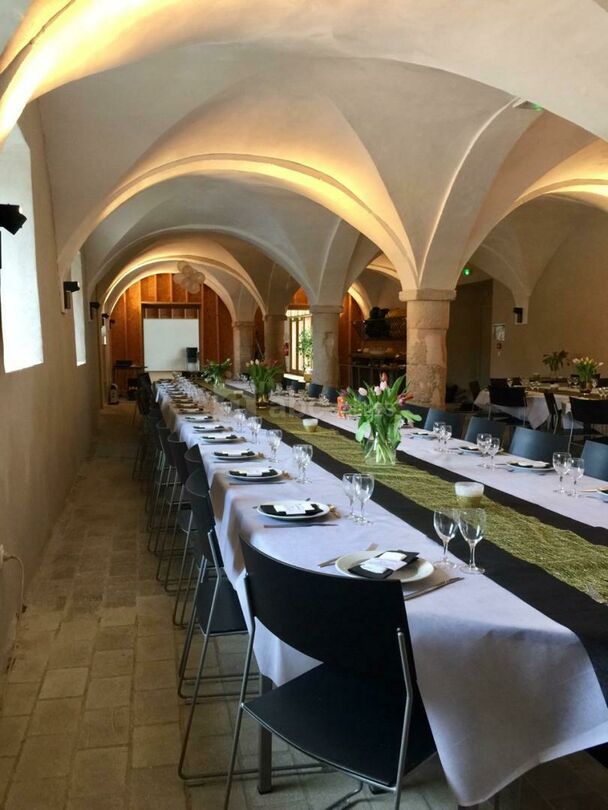 Plus spacieuses, la salle de convivialité (80 m²) et la salle voûtée (120 m²) peuvent quant à elles faire tenir, respectivement, 80 invités en format conférence et jusqu’à 90 convives assis. D’apparence plus adaptée à un public professionnel, la première salle dispose, comme les salles de cours, d’un vidéoprojecteur, d’un grand écran, d’une connexion à internet et de paperboards. Idéale pour les repas et cocktails, qu’ils soient familiaux ou pas, la seconde, elle, prend vie au cœur d’une authentique bâtisse du XVI° siècle et saura ravir les amateurs de lieux d’exception pour des repas/ réceptions.