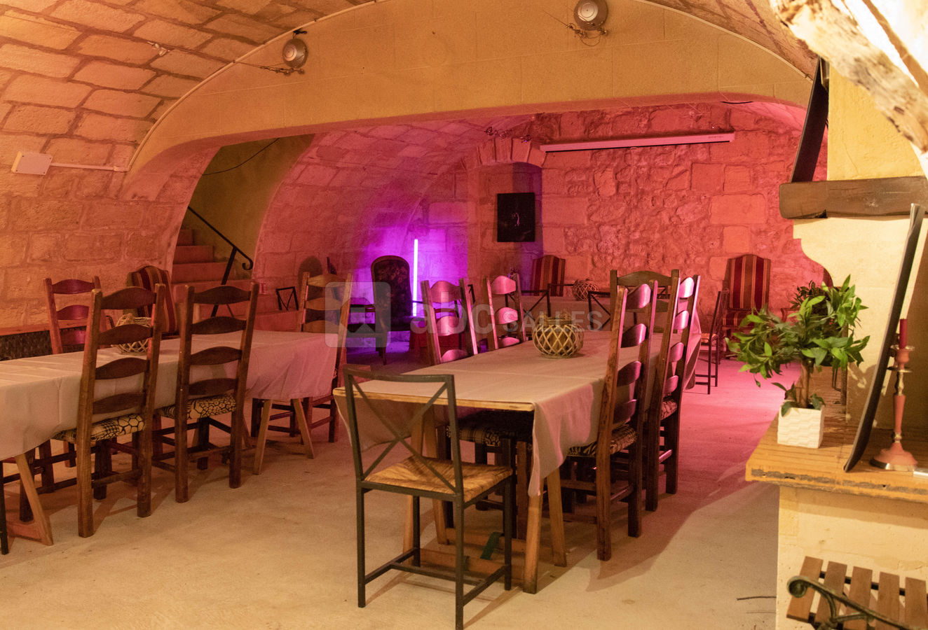 La salle voûtée aux normes et modulable, a une capacité de 25 personnes assises et 50 personnes debout. Elle est équipée d’un vidéoprojecteur pour vos soirées entre amis ou pour vos séminaires.