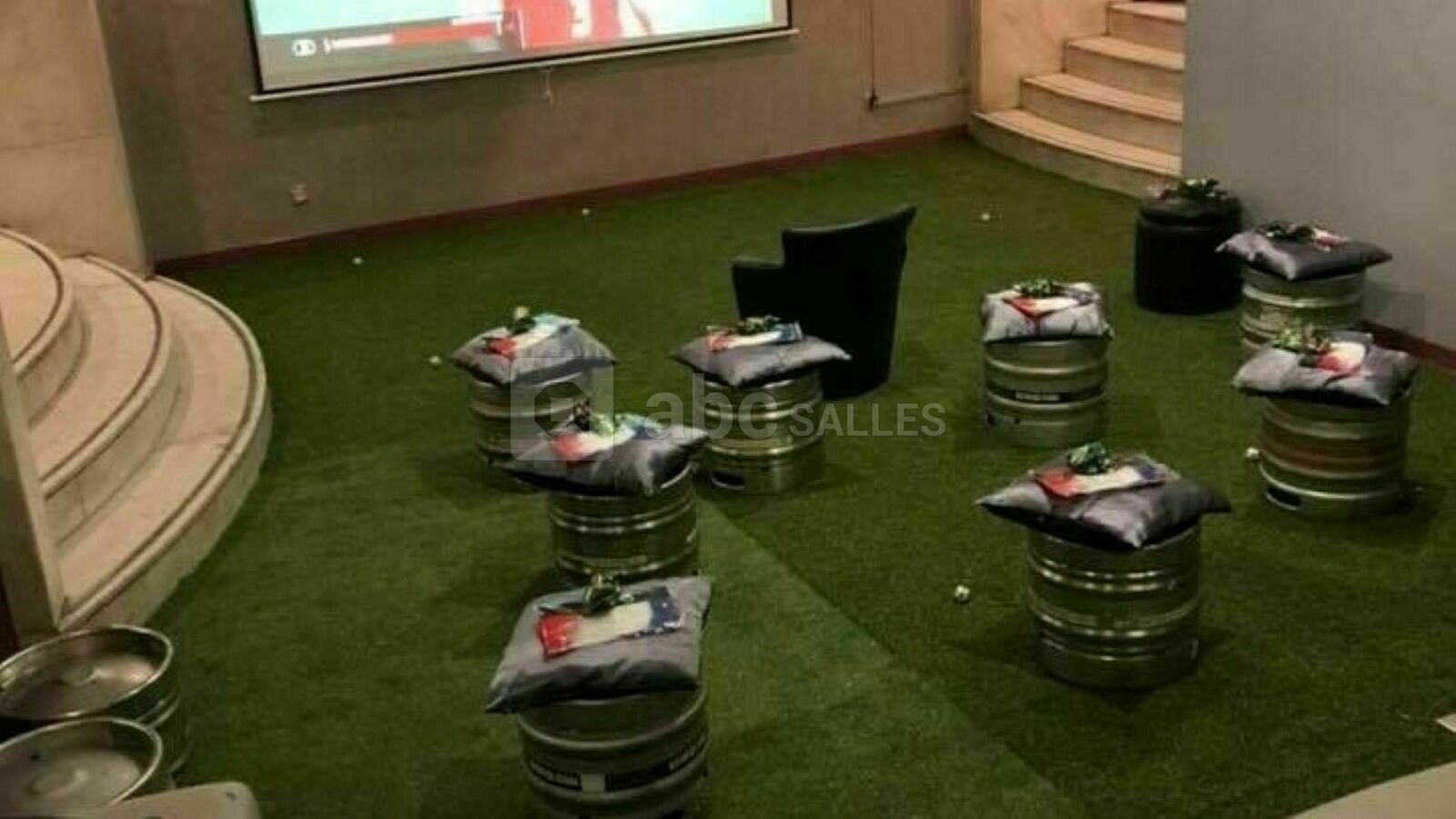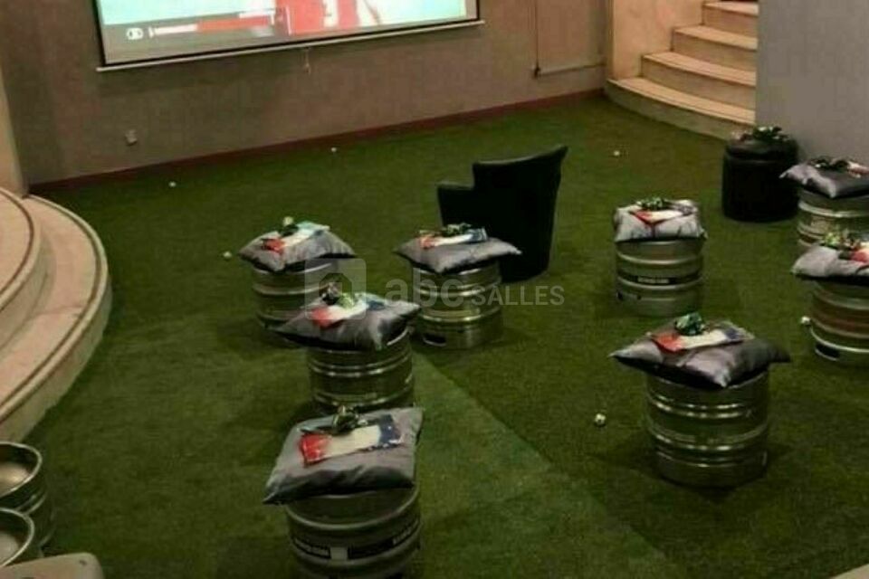 Totalement équipé : mobilier (canapés, fauteuils, tables, chaises...), 3 grand écran TV HD, sonorisation complète, micro HF, wifi, vestiaire, bar avec plusieurs réfrigérateurs... Il ne manque rien !