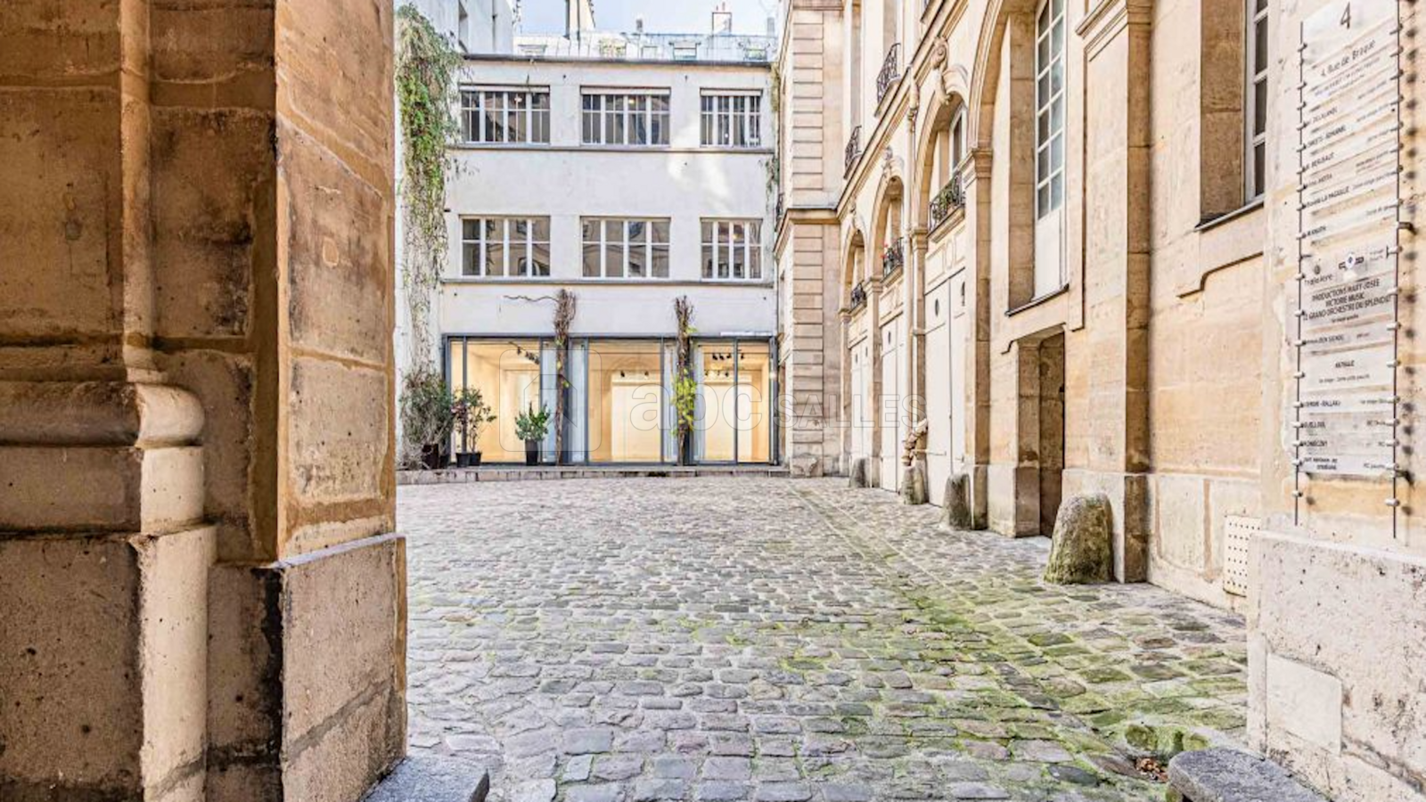 Cet espace a la particularité d’avoir une vitrine donnant sur une cour classée, qui se situe entre la rue des Archives et la rue du Temple.