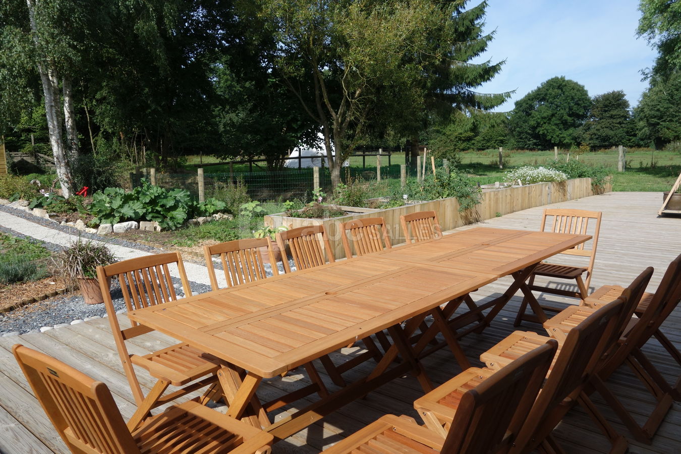 Vous pourrez prendre vos petits déjeuners sur la grande terrasse donnant sur un jardin paysager privatif et les herbages où les poulains se donnent en spectacle. Un petit coin de bonheur.
