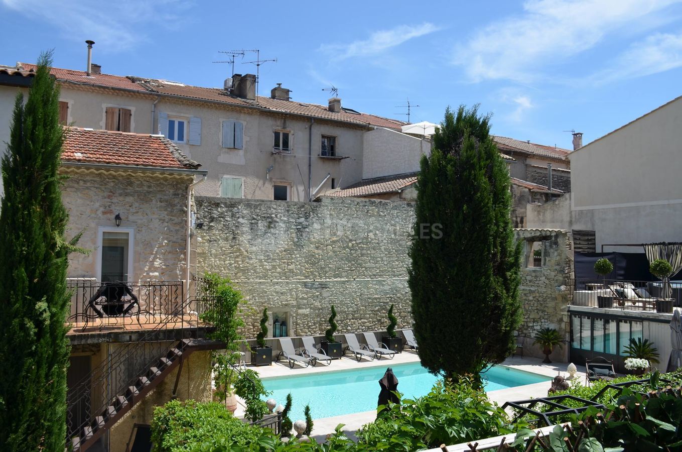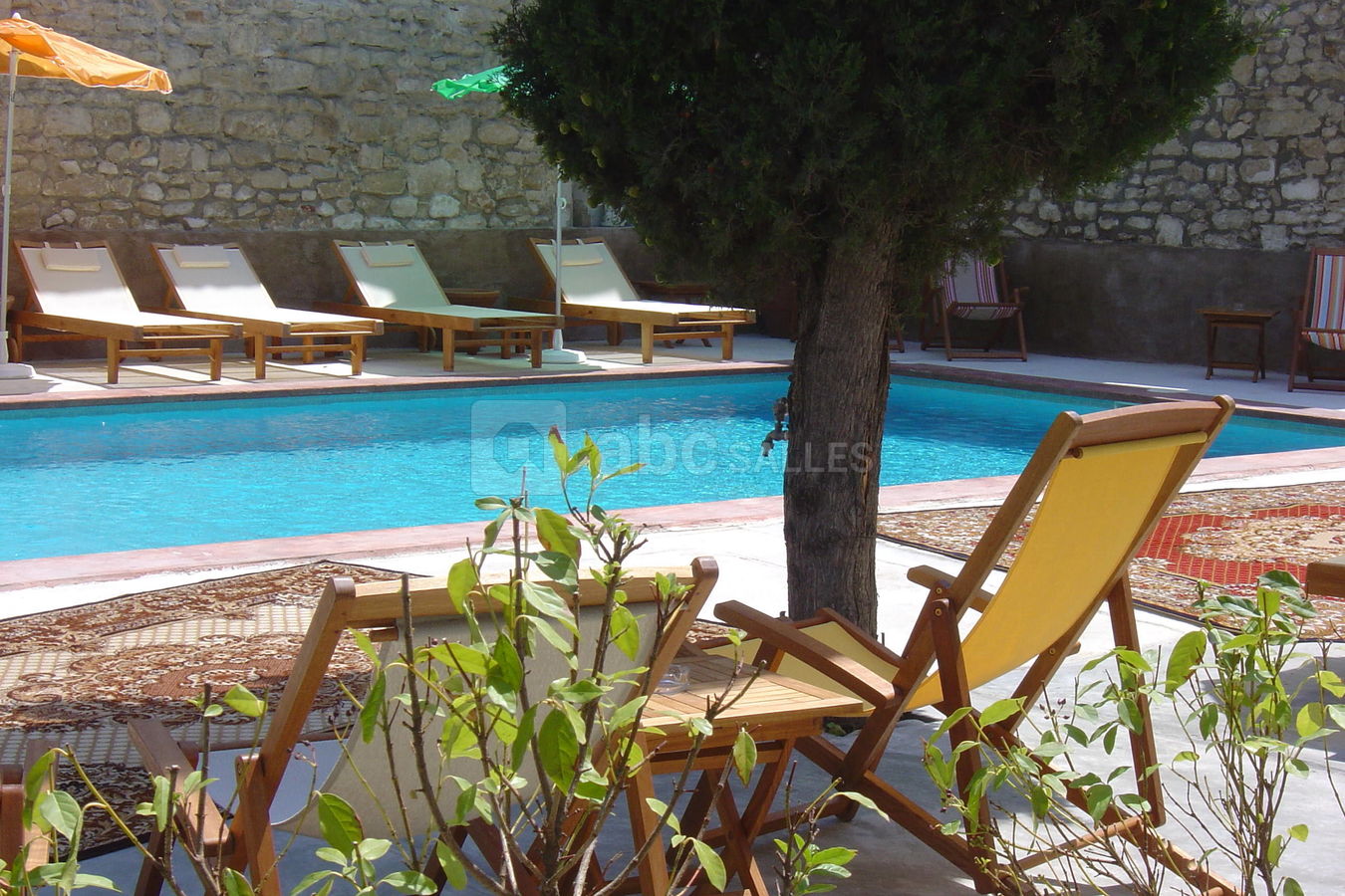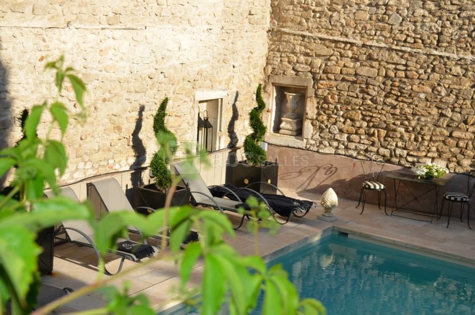 Derrière la bâtisse se cache un lieu unique : le jardin d'agrément vous offre une magnifique terrasse, ses allées pavées de pierre qui conduisent à la piscine, au spa, à la salle de réunion,.. havre de paix en plein cœur de la cité.
