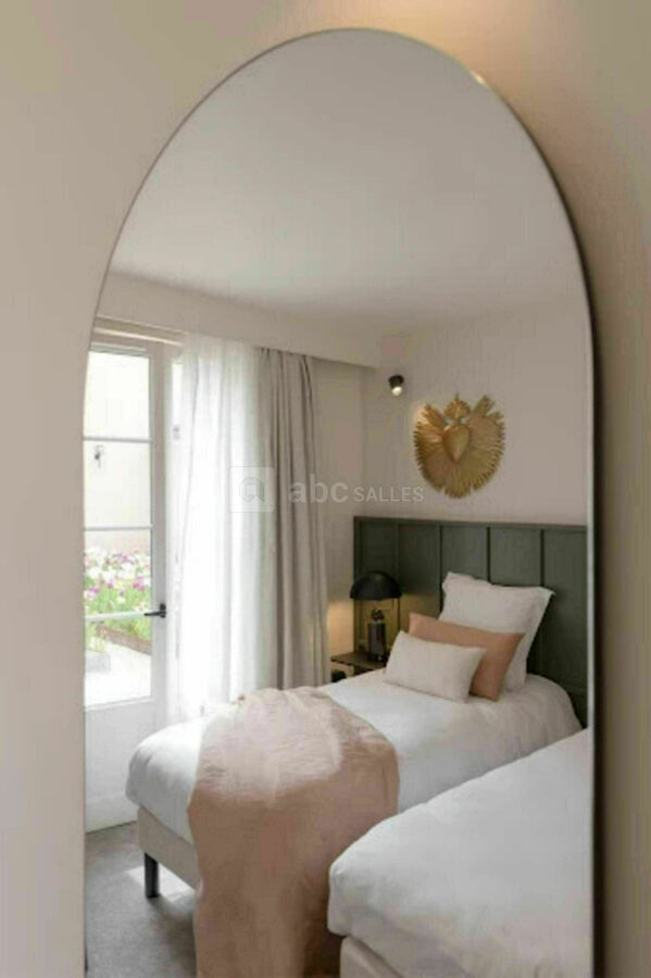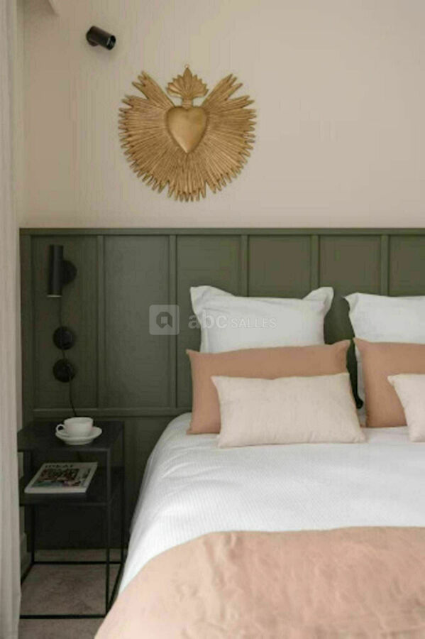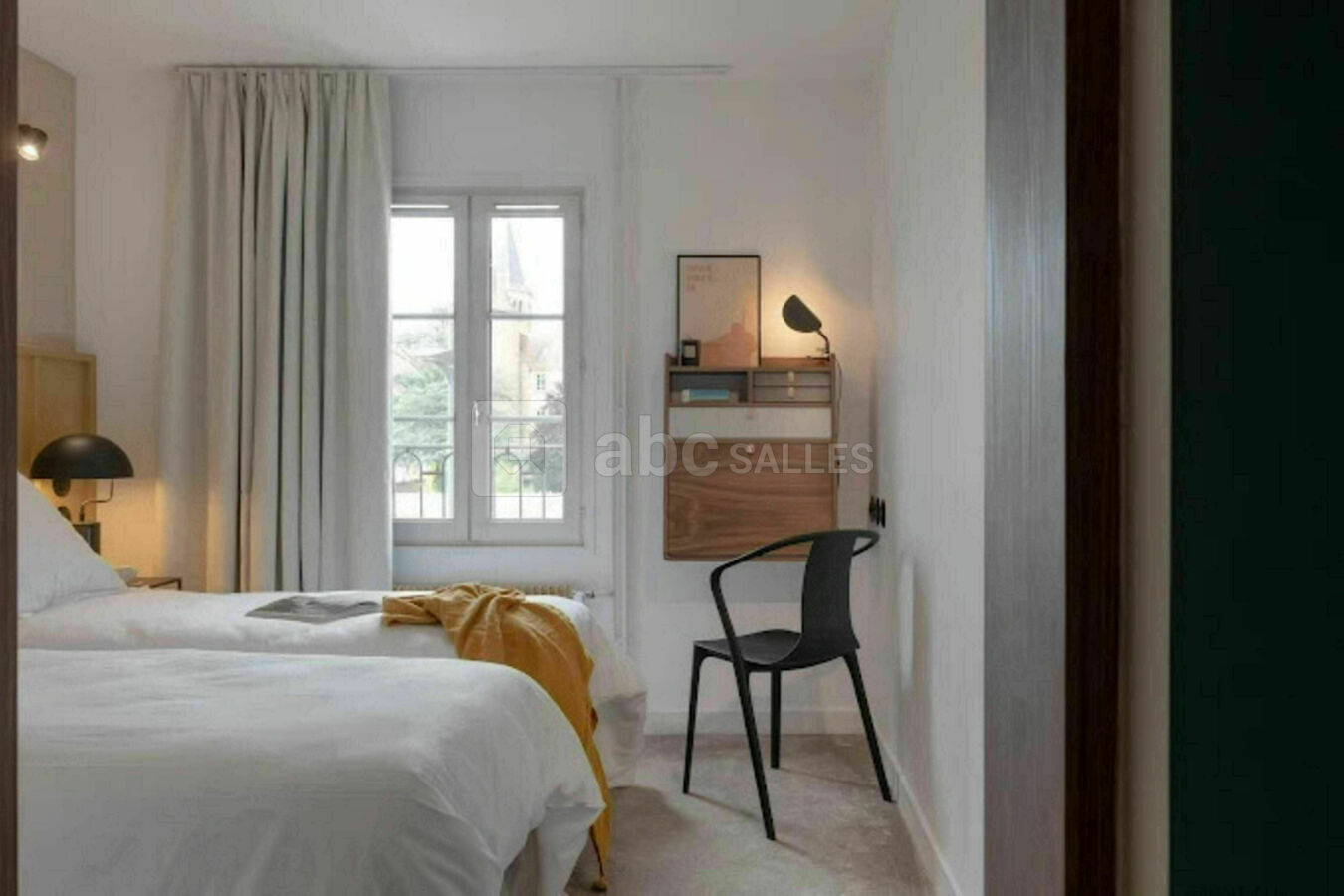 Chaque chambre dispose d’une salle de bain parfaitement équipée, pensée pour offrir une ergonomie optimale et un confort maximal. La décoration élégante et raffinée des chambres évoque subtilement la spiritualité et l’histoire religieuse de Paray‑le‑Monial, à travers des motifs et objets soigneusement choisis. Les signalétiques des chambres rappellent les édifices consacrés au Sacré-Cœur de Jésus dans le monde, faisant écho à la dimension universelle et spirituelle de la ville.