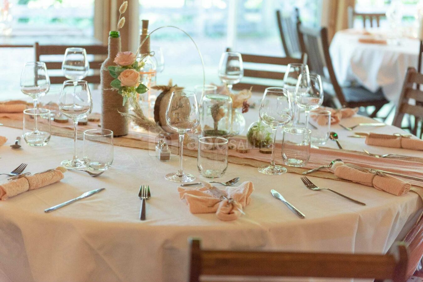 Une salle de réception de 200 m² pouvant accueillir jusqu’à 120 personnes, entourée de terrasses en bois.