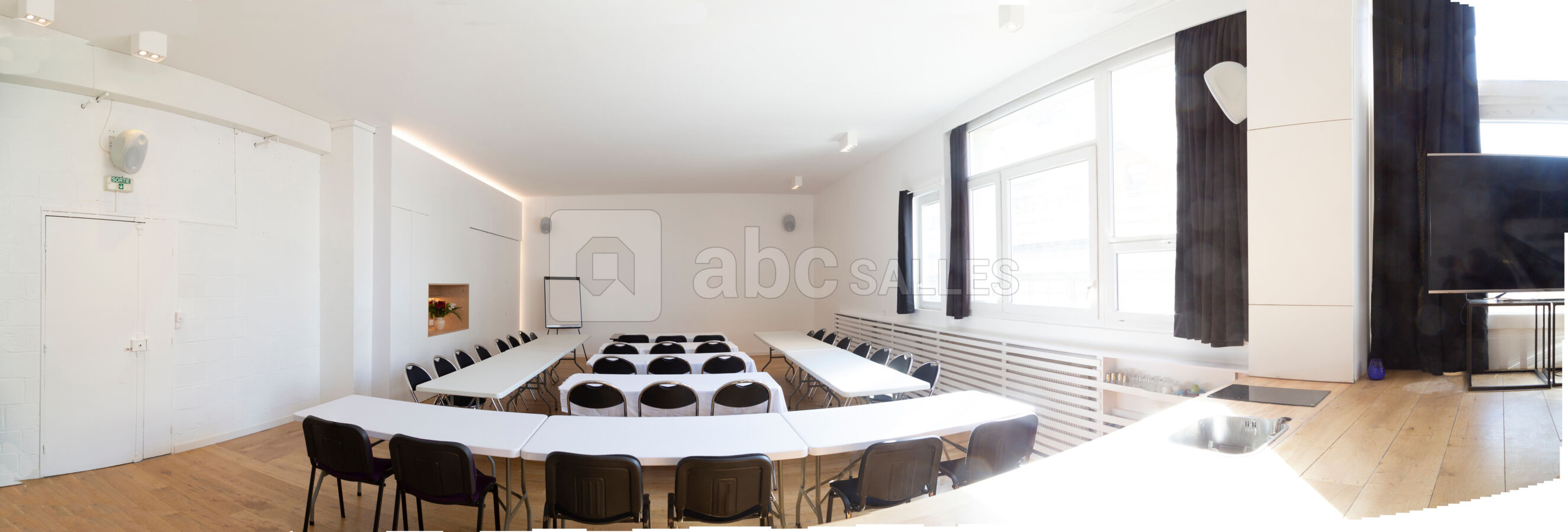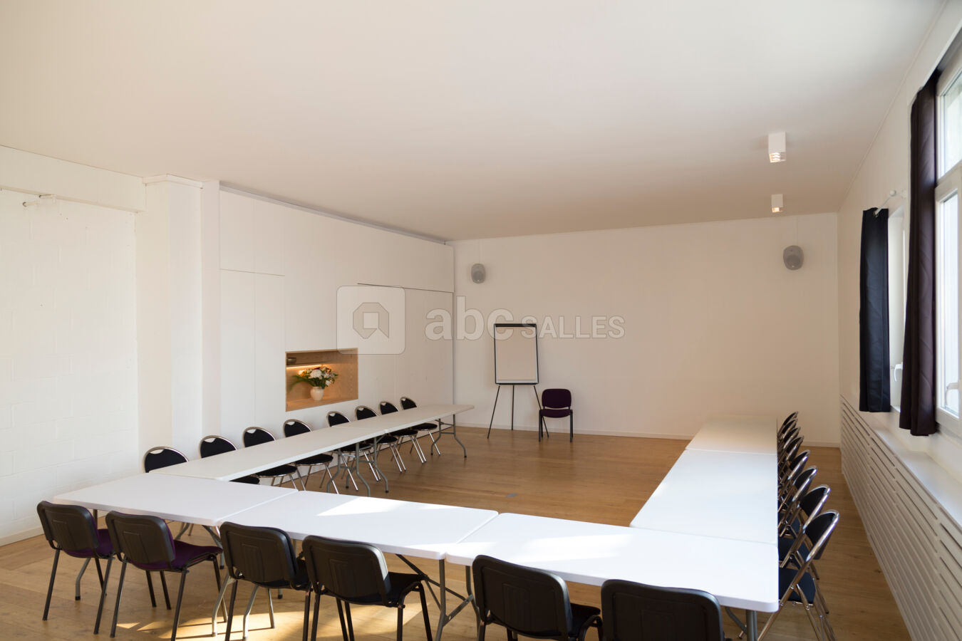 Tables, canapé, chaises, vidéoprojecteur, sono, micro, coin cuisine (bouilloire, machine à café, tasses )