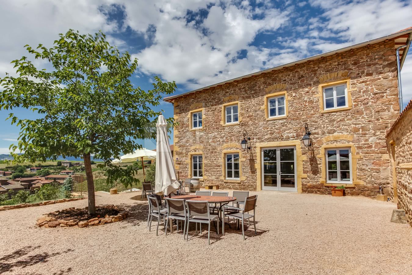 Idéalement située, cette Bastide du 19ème siècle est dotée d'une magnifique terrasse panoramique en passant par l’élégante cour intérieure ornée d’un puits d’époque, d'une grange aménagée de 300 m² donnant la possibilité de cérémonie laïque (100 chaises blanches à disposition) ou de vin d'honneur en cas de mauvais temps (également équipée d'une petite cuisine et de deux WC individuels), c'est un lieu magique où se mêlent architecture en pierres dorées et charme du vignoble beaujolais.