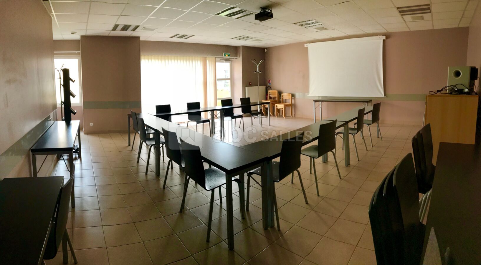 Salle de 100 m² : rétroprojecteur, sonorisation, écran rétractable, chaines TNT