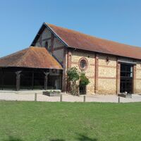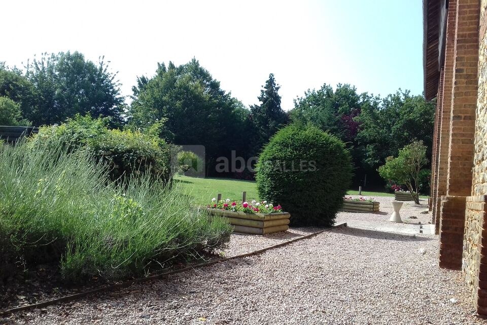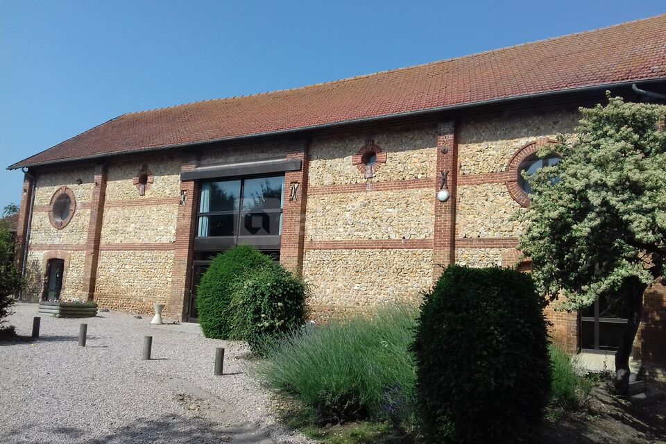 Avec ses murs de briques et de pierres, sa charpente apparente, ses grandes baies vitrées, son espace extérieur, La Grange de Berville-sur-Mer est un lieu atypique aux volumes exceptionnels.