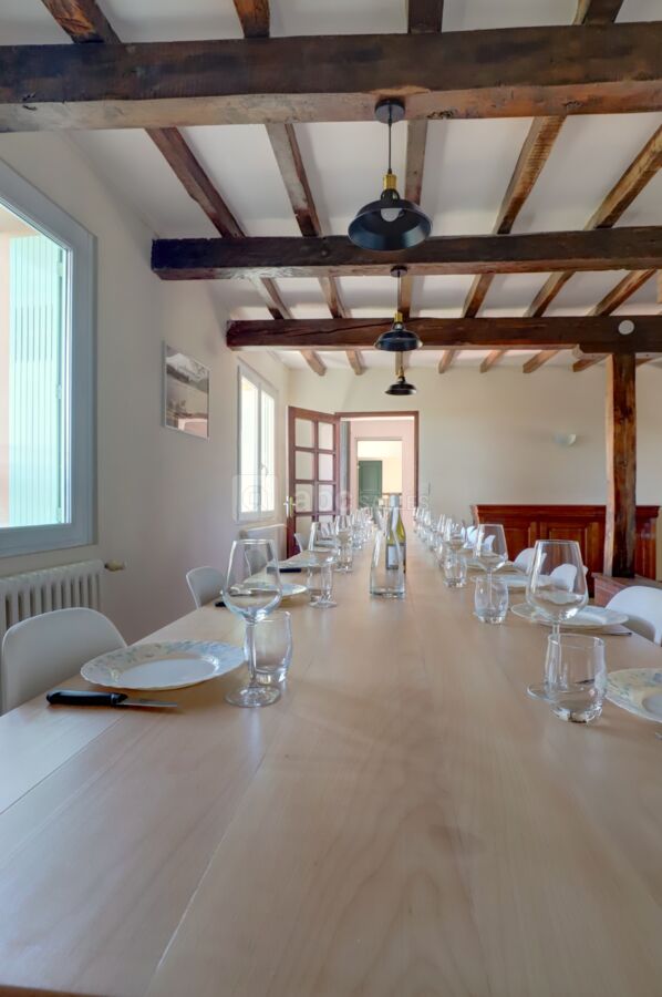 Une grande cuisine équipée, salon, salle à manger avec ses grandes tables campagnarde de 15 places et les 8 chambres, avec 4 salles de bains et 4 wc séparés permettent l’accueil de groupes importants avec le plus grand confort.