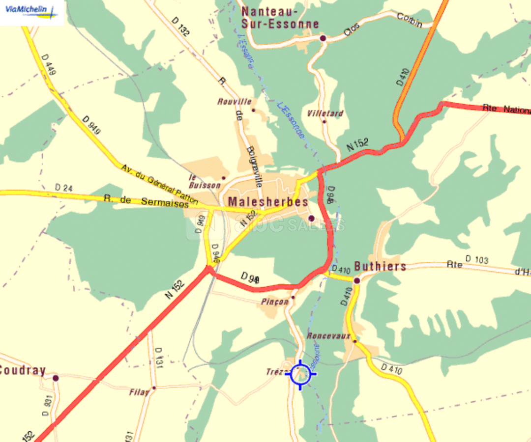 Sortie A6 N°14 direction Malesherbes (15 mn de l'autoroute) prendre la rn 152. A L'entrée Malesherbes, prendre à gauche tout de suite direction pincon , trezan et pithiviers. Au rond point, première sortie puis prendre à gauche direction briarres ;Traverser les deux hameaux de pincon et trezan. Sortie Trézan, passer sous un pont, et 200m plus loin sur la gauche, prendre le chemin de la messe (impasse) et entrer dans la propriété au N°7 parking au fond vers sous bois. 80 km de paris ; 25 km de fontainebleau ; 24 km de Nemours ; 60 km d'Orléans ; voir plan d'ACCES.