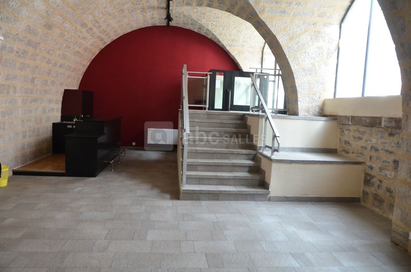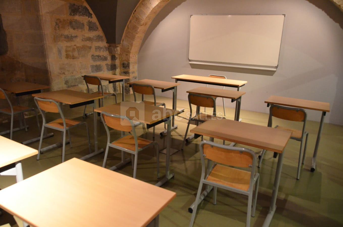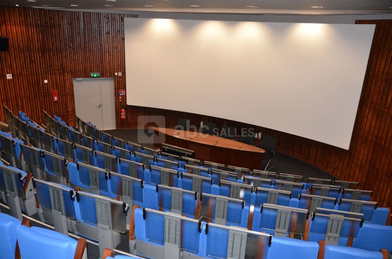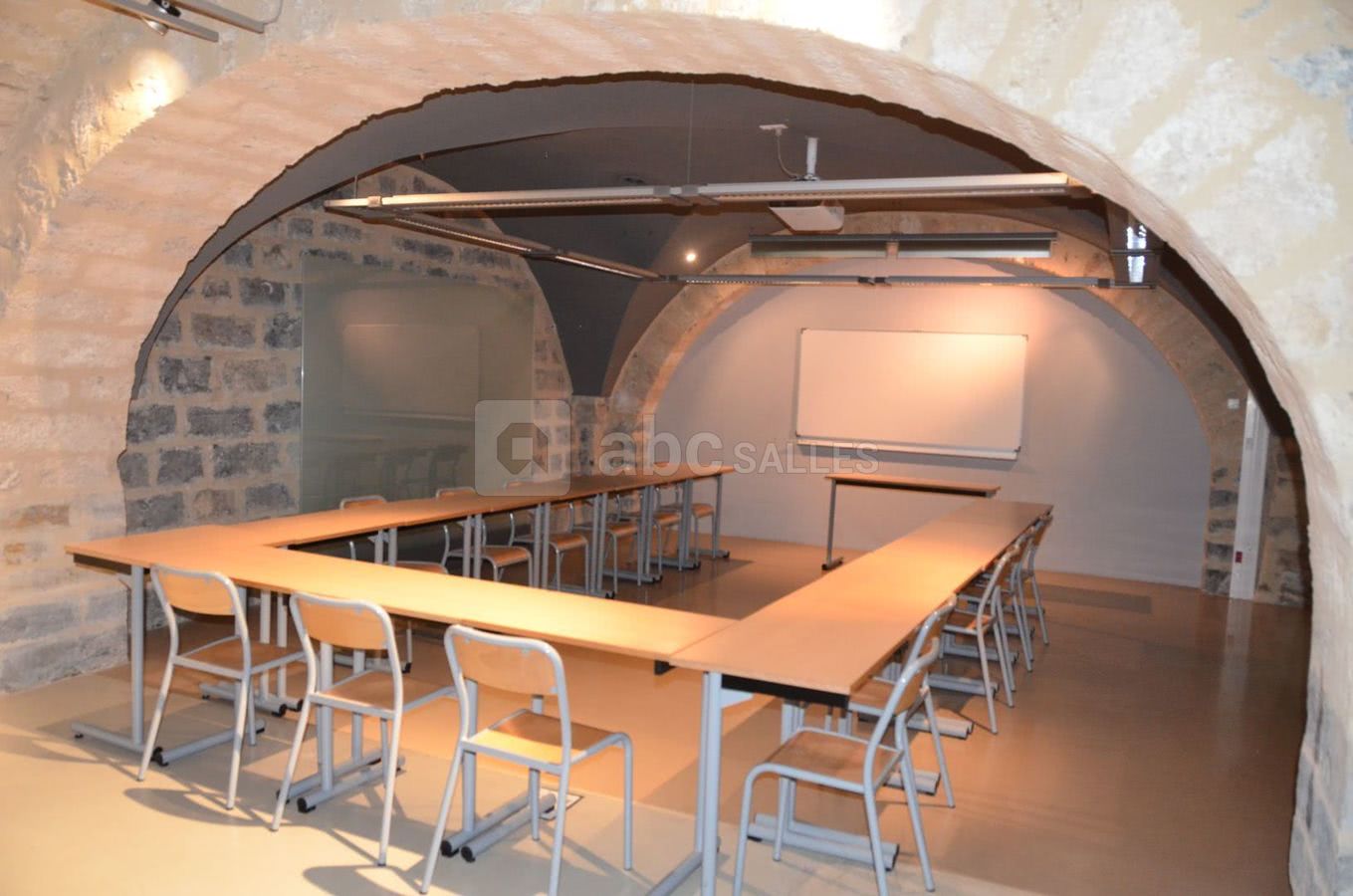Dans l'auditorium, nous disposons d'un grand écran 8m X 3 m suspendu, parc de micros filaires et HF adaptés aux besoins, mur acoustique en bois verni, plafond abat-son gris, pupitre ovale 3,85 m x 0,80 m en bois pouvant accueillir 5 personnes. Espace réception : salle climatisée sous voûte de 50 m², bar équipé d'un réfrigérateur, lave-verres, armoire vestiaire, tables basses et fauteuils, accès direct sur l'extérieur, accès handicapés par monte personnes. 3 salles voûtées équipées de tables et chaises en bois, tableau blanc, dont deux avec vidéo-projecteurs.