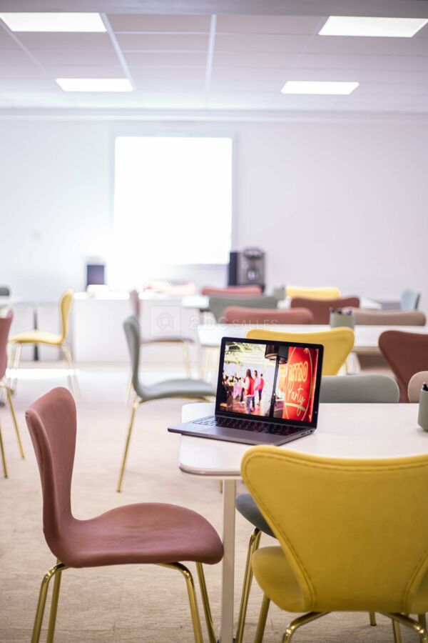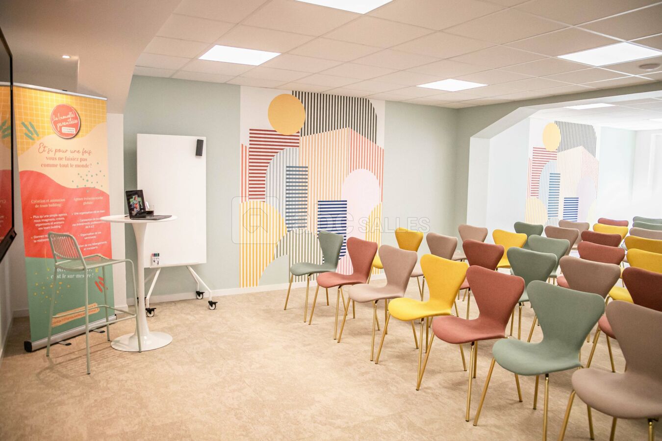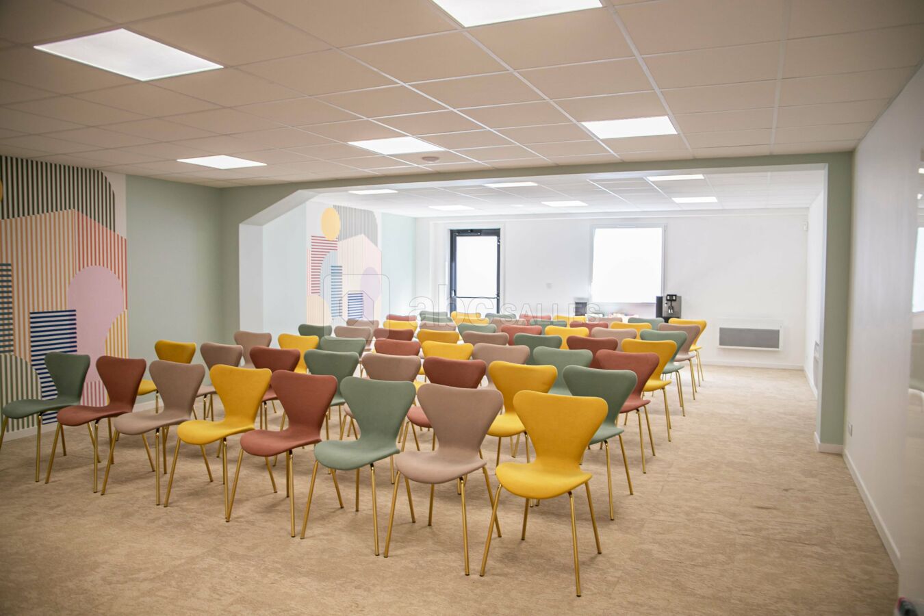 Équipé d'un écran interactif et de tout le matériel nécessaire à la réflexion et à la créativité, l'espace de 70 m² permet de vous installer en disposition U, théâtre, classe ou îlots.