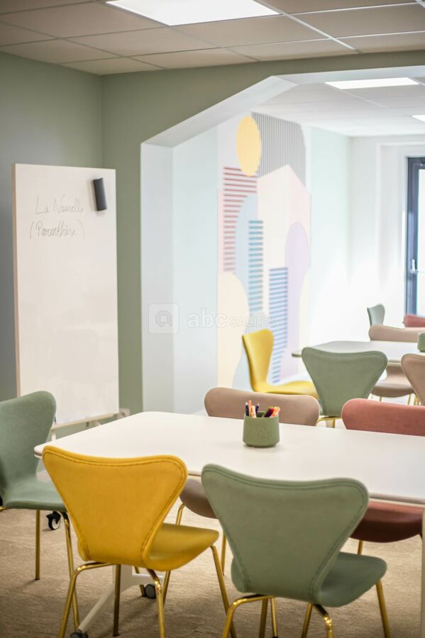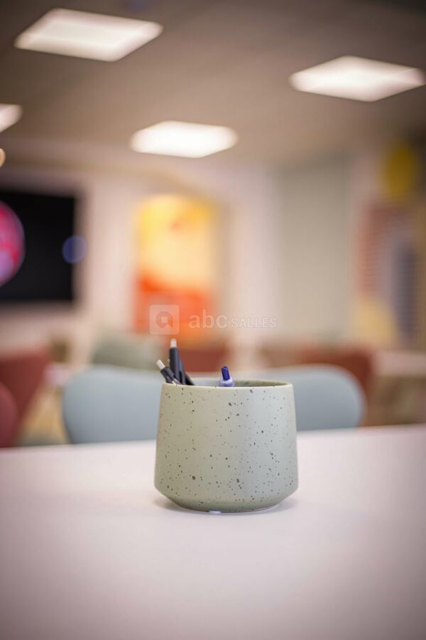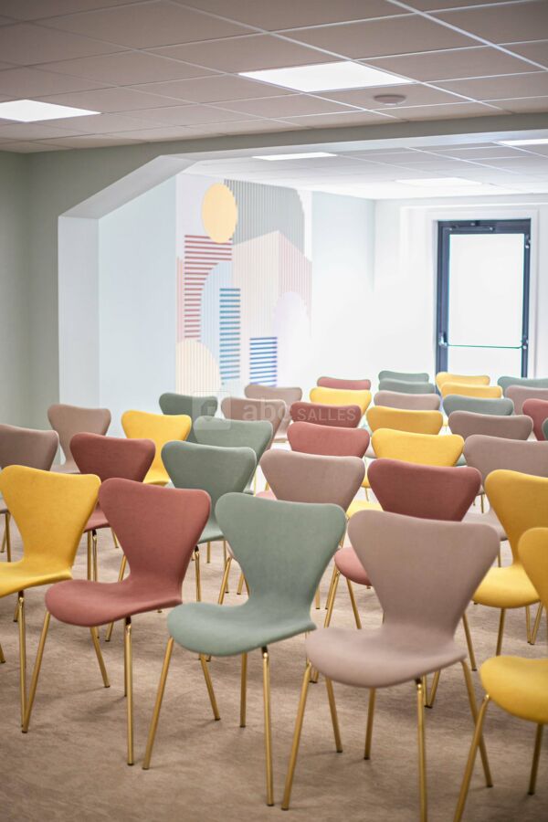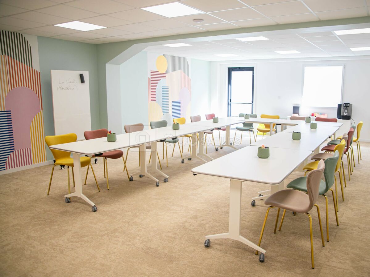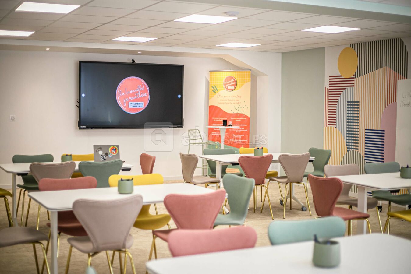 Équipé d'un écran interactif et de tout le matériel nécessaire à la réflexion et à la créativité, l'espace de 70 m² permet de vous installer en disposition U, théâtre, classe ou îlots.