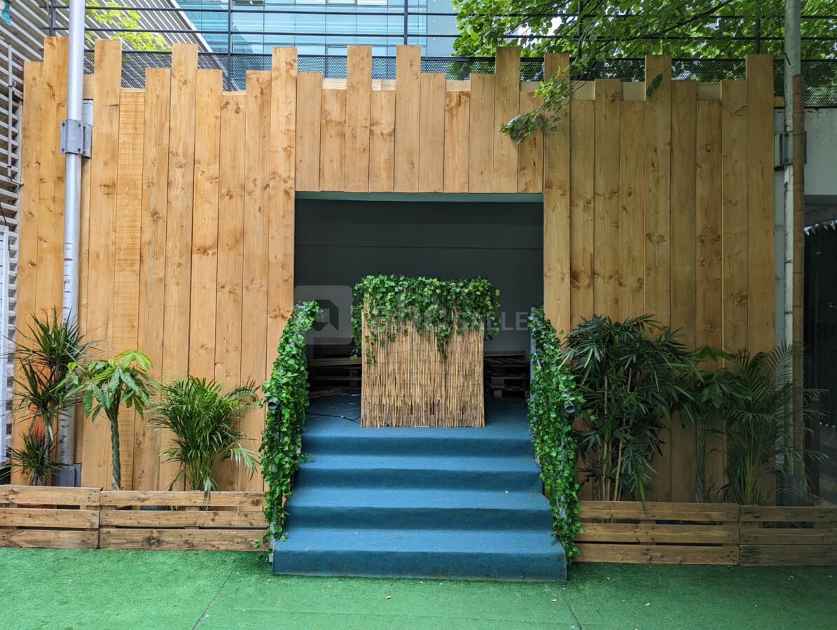 C’est un espace entièrement en extérieur covid-friendly avec gazon, assises, tables et bar palettes.