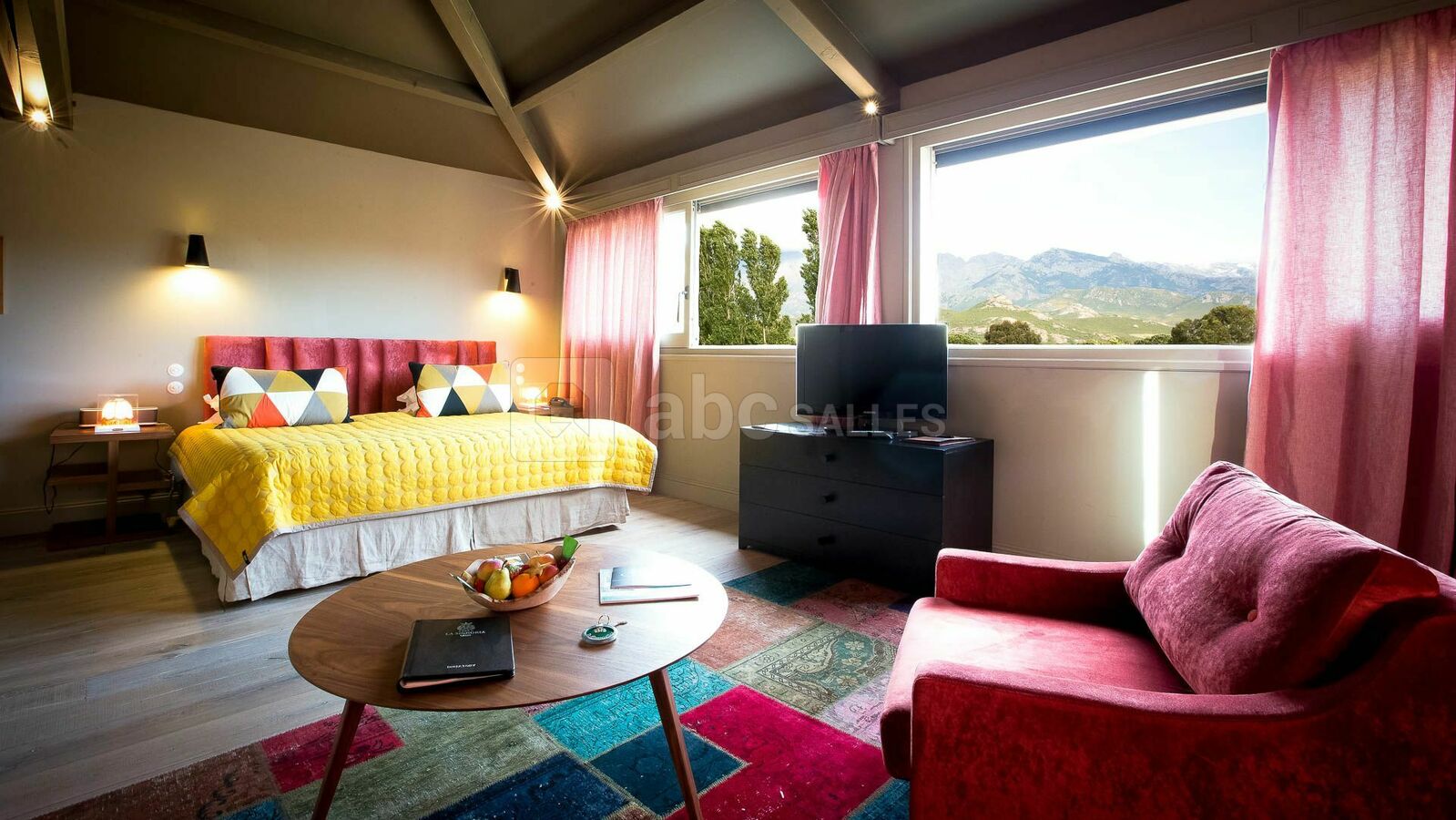 D’un corps de bâtiment à l’autre, toutes les époques, styles, et influences rehaussent la simplicité des éléments architecturaux historiques. Toutes les chambres et suites ouvrent de plain-pied sur l’extérieur. Elles disposent d’une terrasse ou d’un balcon, orientés sud/sud-ouest, avec vue sur le parc et/ou les montagnes. Décorées avec goût et raffinement, elles chantent un hymne à la couleur et à l’art de la patine. Marie Ceccaldi s’est impliquée avec talent dans la décoration pleine de charme, chinant soigneusement meubles et objets.