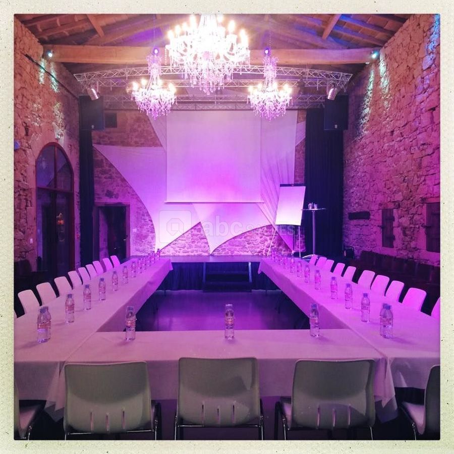 La salle de réception est entièrement équipée en son et lumières (déjà installé prêt à l'emploi). Elle dispose également de mobiliers ( tables rondes et rectangles, mange-debout, chaises...) et d'une scène.