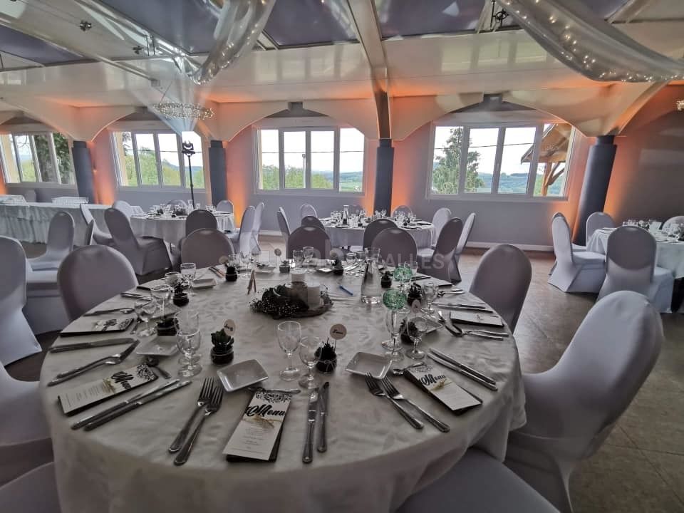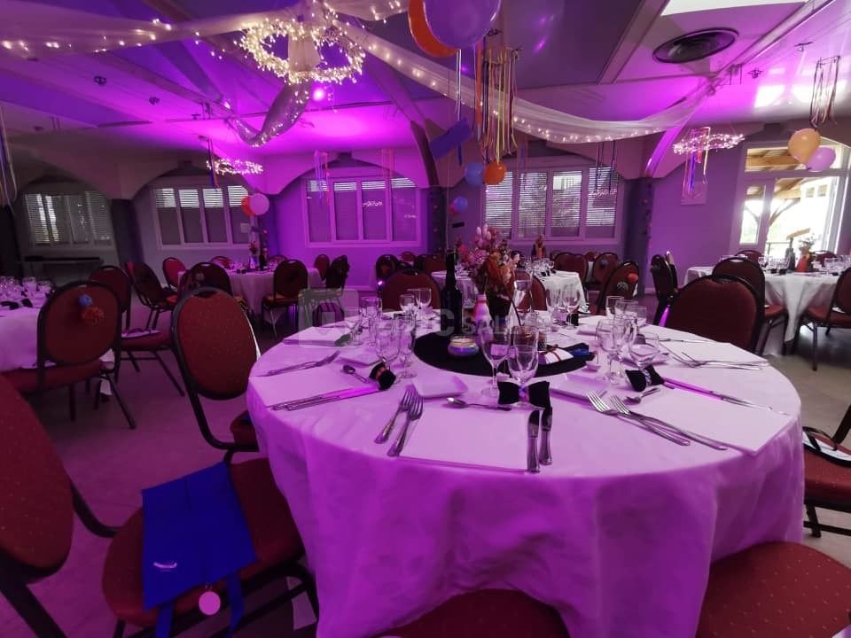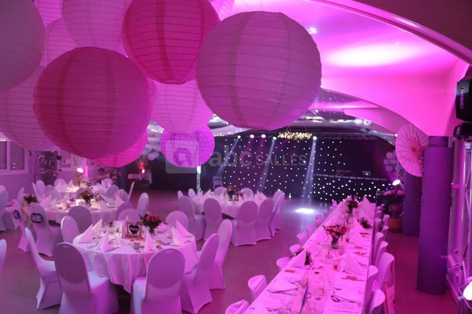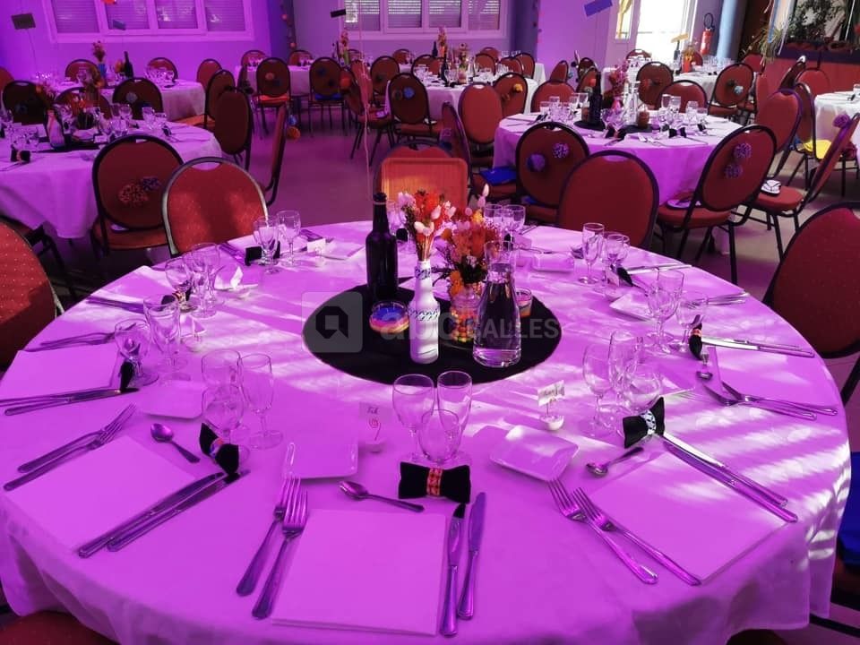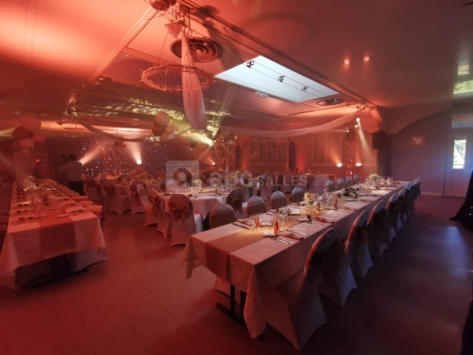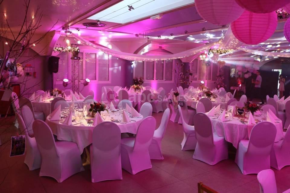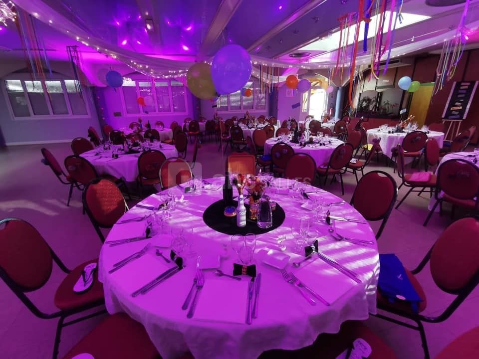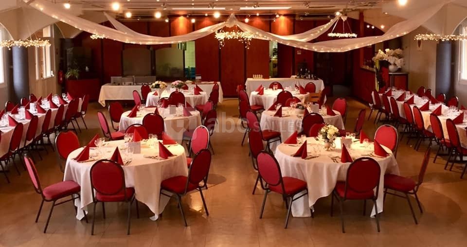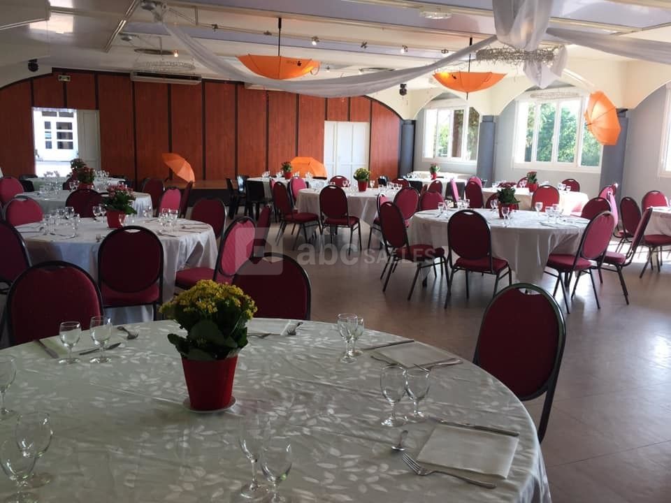 - Salle de réception : Une belle salle de 220 m², climatisée, de plain pied accessible en fauteuil disposant d'une estrade pour l'animation, un espace bar, un vestiaire. Nous l'équipons gratuitement avec tables rondes (8 et 10 personnes) ou tables droites, chaises rouges ou chaises noires, vaisselle moderne.