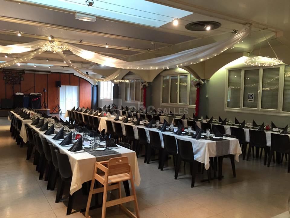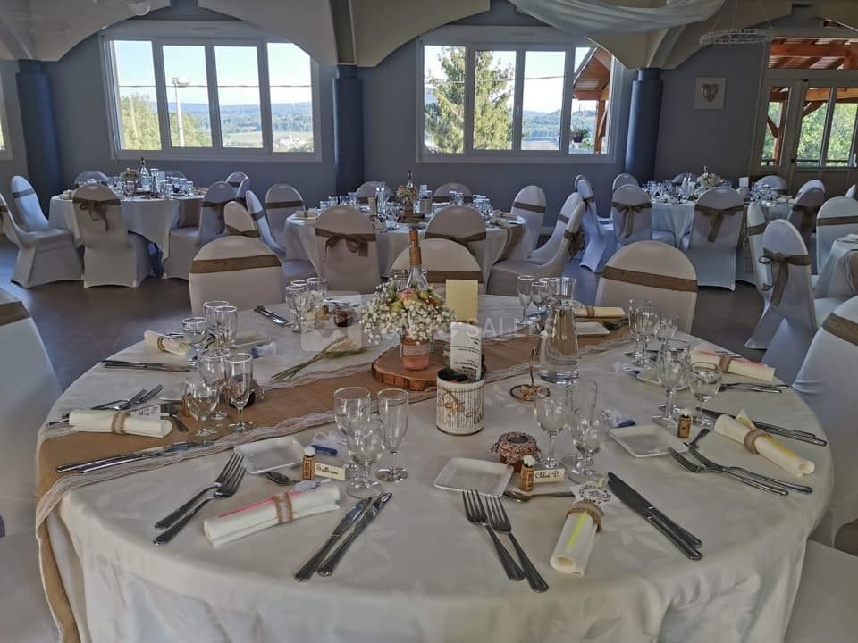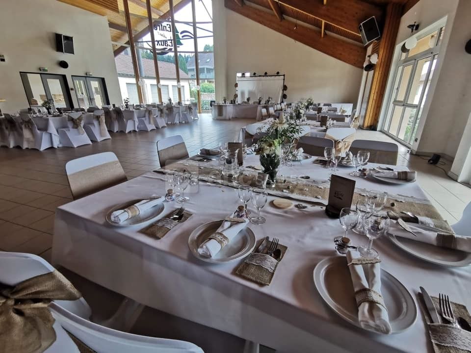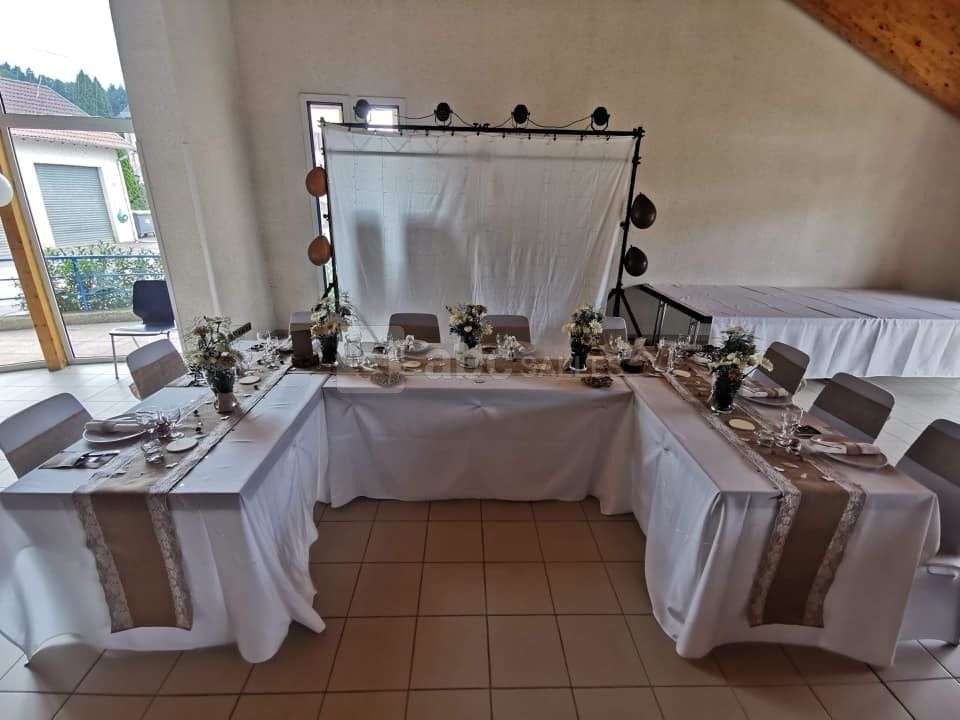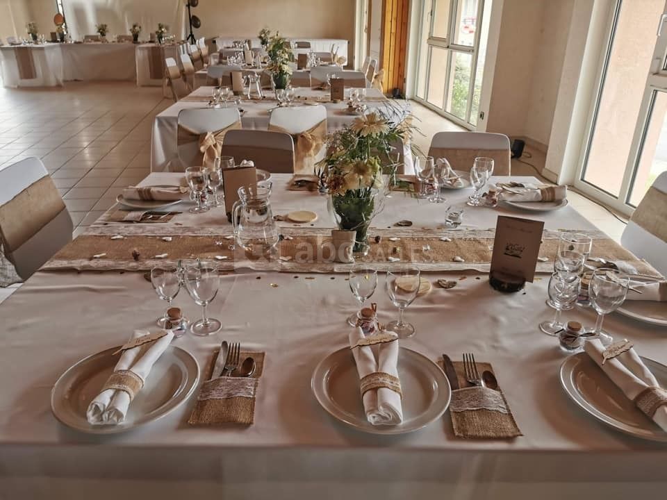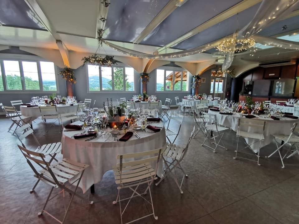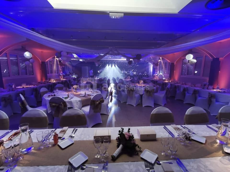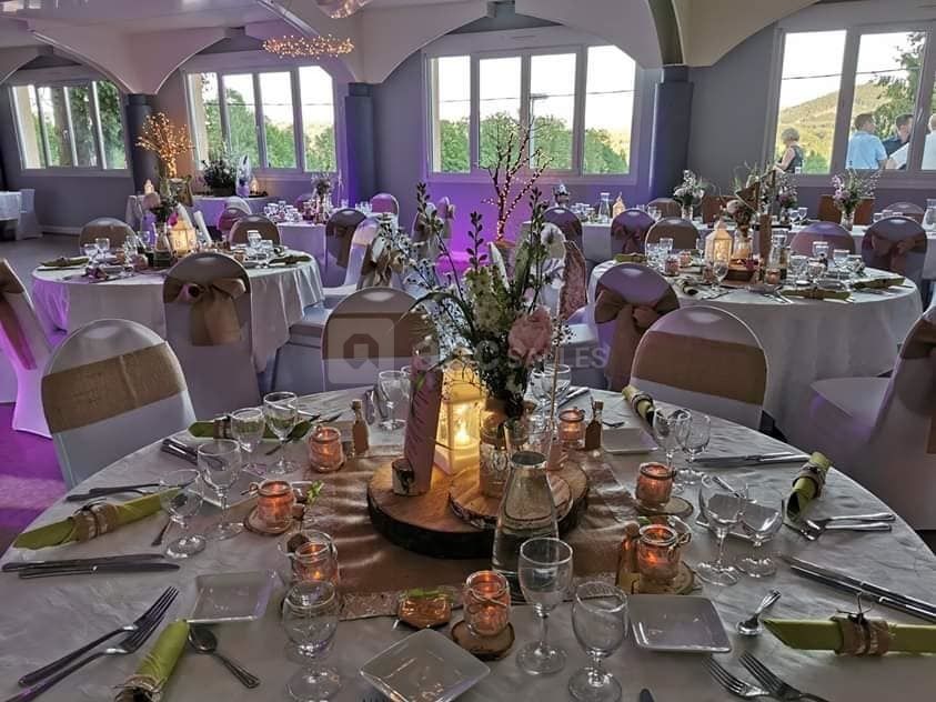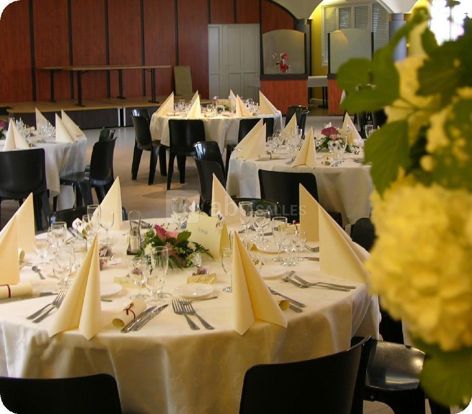 - Salle de réception : Une belle salle de 220 m², climatisée, de plain pied accessible en fauteuil disposant d'une estrade pour l'animation, un espace bar, un vestiaire. Nous l'équipons gratuitement avec tables rondes (8 et 10 personnes) ou tables droites, chaises rouges ou chaises noires, vaisselle moderne.