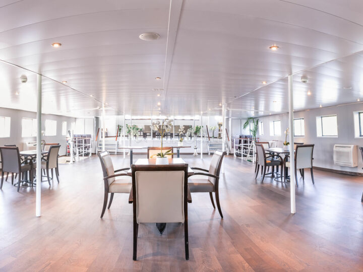 - La Salle de réception du bateau qui dispose d'une surface au sol de 170 m² et qui peut accueillir jusqu'à 200 personnes en cocktail et 130 personnes en banquet (repas assis).