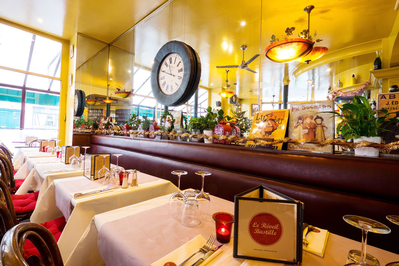 L'équipe aux commandes a remonté ce "Réveil", vieux bistrot des années trente. En ne changeant rien au décor, ils ont su garder son authenticité : comptoir arrondi en zinc, chaises Thonet, banquettes en cuir, .. vrai bistrot parisien à l'ancienne, comme on les aime !