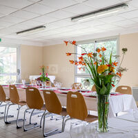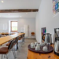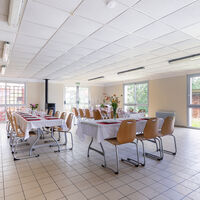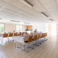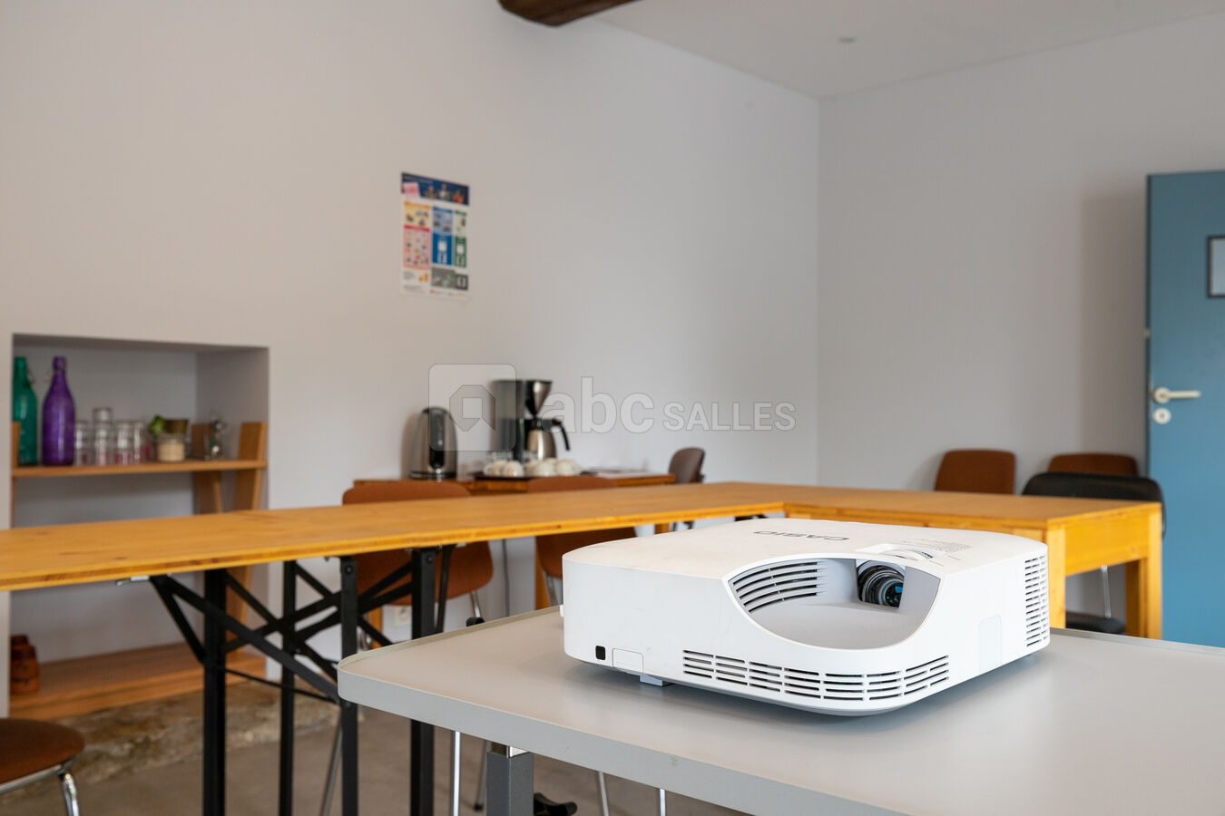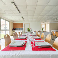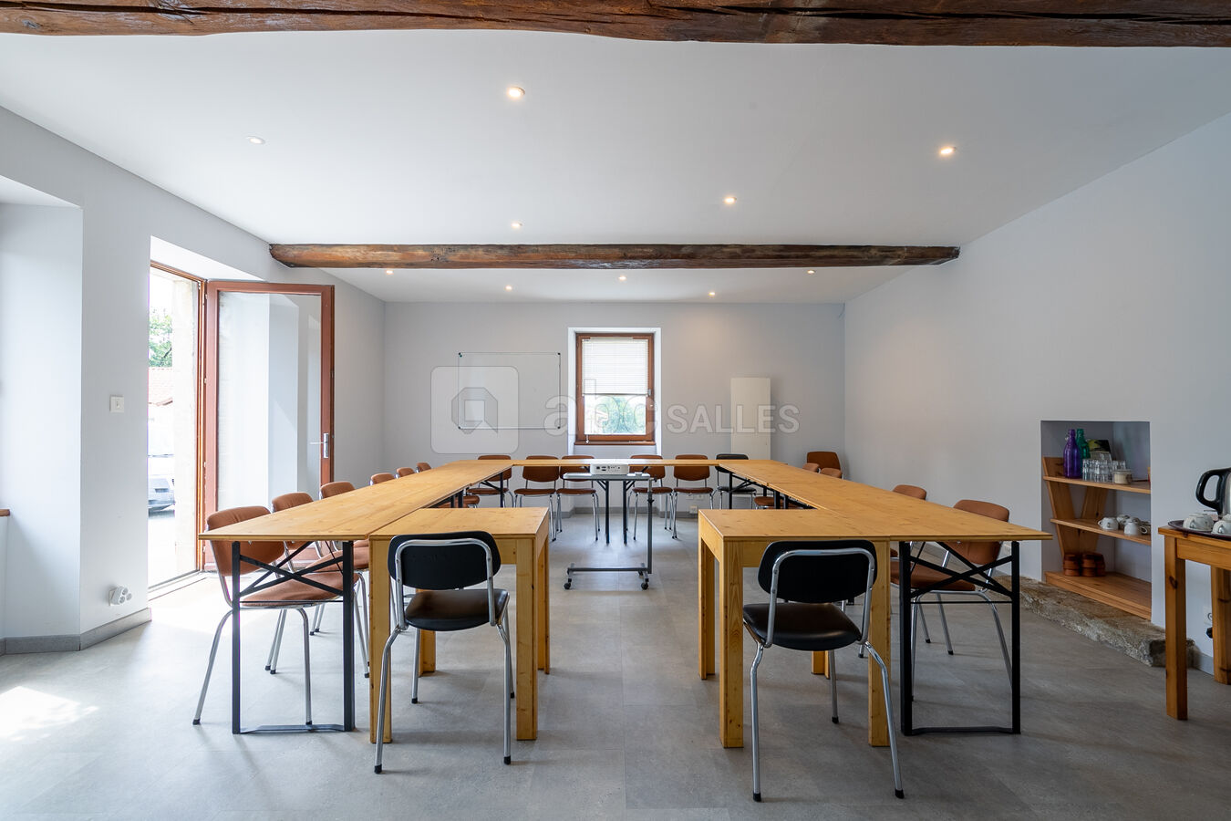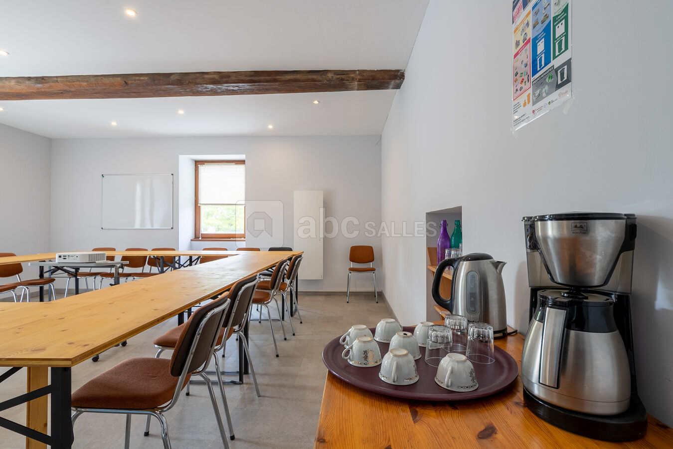 Matériel : tables, chaises, vaisselle, couverts, linge de table, cafetière et bouilloire (consommables non inclus), matériel de projection (vidéoprojecteur + écran de projection), wifi, paperboard
