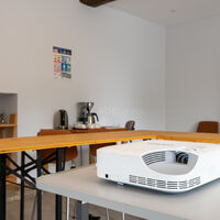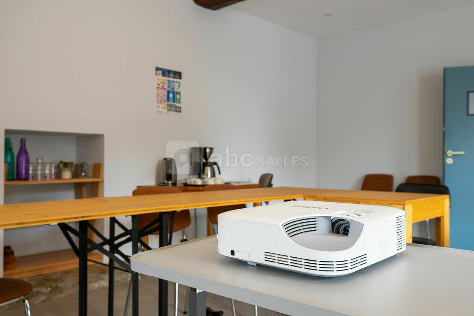 Matériel : tables, chaises, vaisselle, cafetière et bouilloire (consommables non inclus) ,matériel de projection (vidéoprojecteur + écran de projection), wifi, paperboard, tableau blanc
