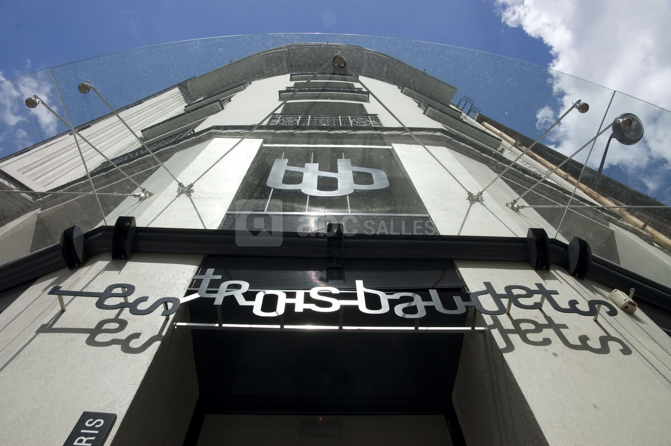 S'élevant entre Pigalle et Blanche, à l'angle du boulevard de Clichy et de la rue Coustou, Les Trois Baudets se lovent derrière la façade Art déco d'un immeuble au carrefour des légendes du 18ème arrondissement de Paris. Entre gloires et misères, sur le siècle éternel de la comédie humaine, le 64 boulevard de Clichy brille et fait à nouveau briller la chanson. Le hall d'accueil, au rez-de-chaussée : 90 m², lumineux (grandes baies vitrées), tourné sur la rue, alternance de rouge, de blanc et de noir, les murs et sols déclinent l'univers visuel des trois baudets. L'entrée principale de la salle, à l'étage inférieur : 100 m², escalier de verre et de pierre, sol constellé évoquant le macadam des trottoirs du quartier, lumières rasantes, bar attenant à la salle. La salle Jacques Canetti : 160 m², salle de 250 places (150 assises, fosse, balcon), la “boîte à chansons" car conçue sur le principe de la boîte dans la boîte : un caisson, monté sur ressort quatre sas permettent au public de pénétrer dans l'enceinte musicale, scène en éventail de 30 m², salle insonorisée et climatisée, couleurs : rouge et noir, un escalier permet l’accès des loges directement sur la scène. Au premier étage, le bar et le restaurant : 120 m², vue dégagée et panoramique sur le mail du bd de Clichy, larges ouvertures, banquettes, miroirs et lumières diffuses. Mobilier de designer (The Conran shop), possibilité ou non d’utiliser ce mobilier. Sous la scène, les loges et le bar des artistes niveau -2 : 30 m², deux grandes loges et une petite. Superficie générale : 1000 m²
