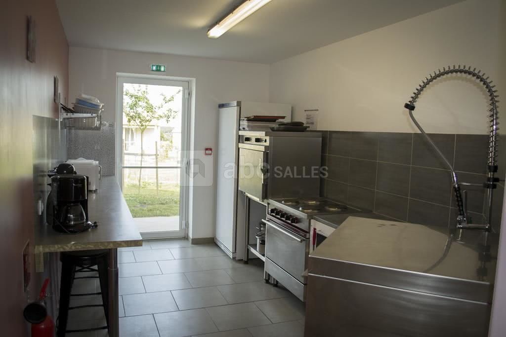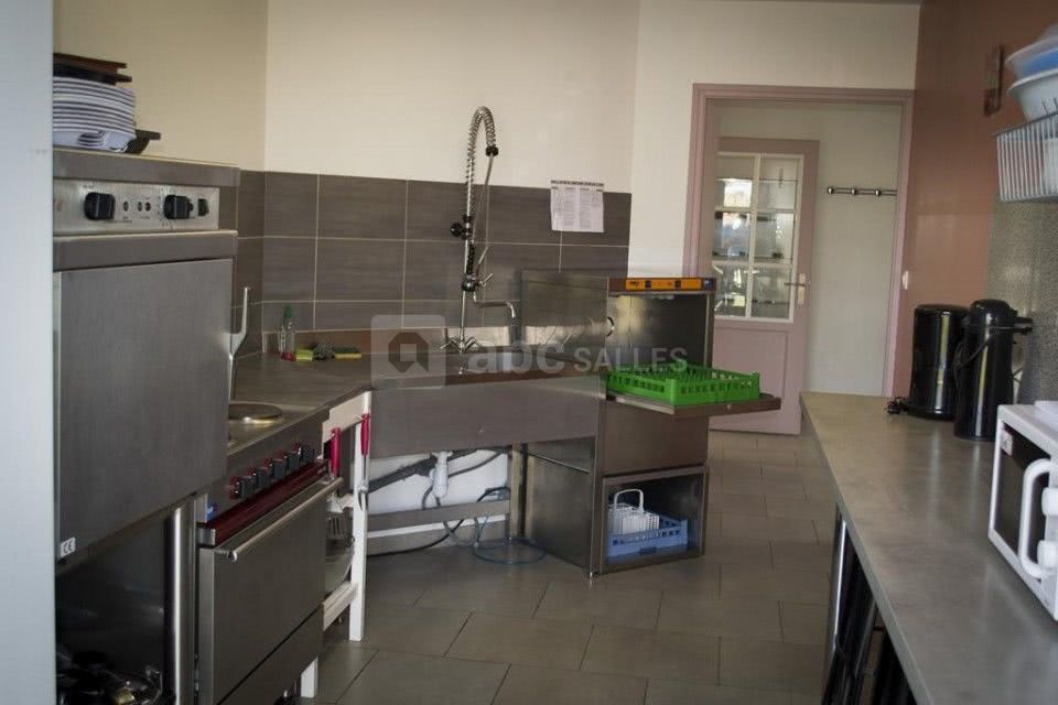 Réfectoire équipé : Grand réfrigérateur, four, plaques électriques, évier, lave vaisselle, armoire chauffante, plan de travail