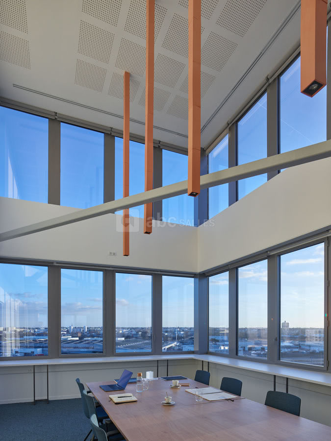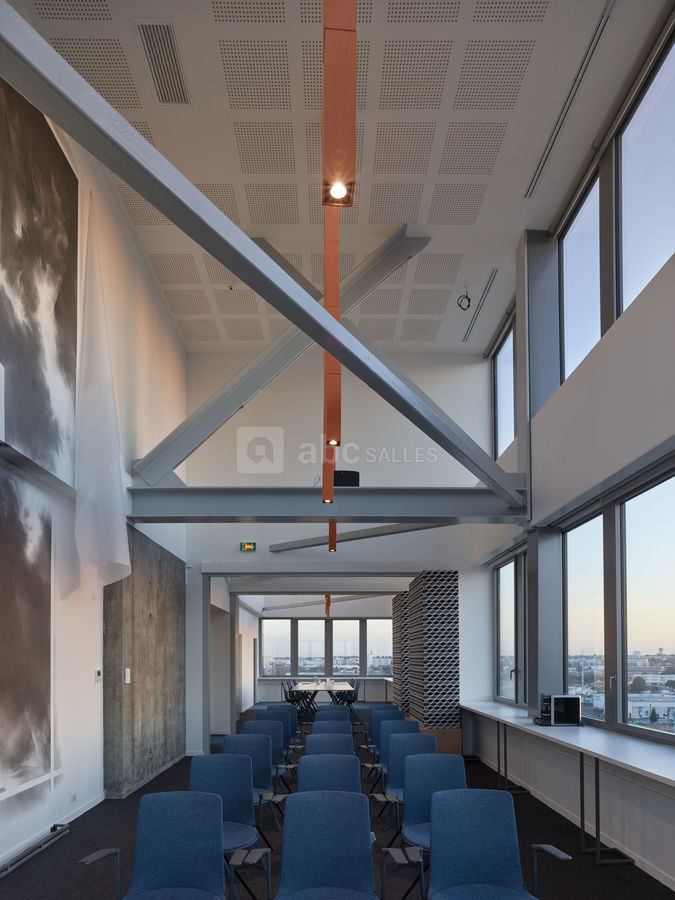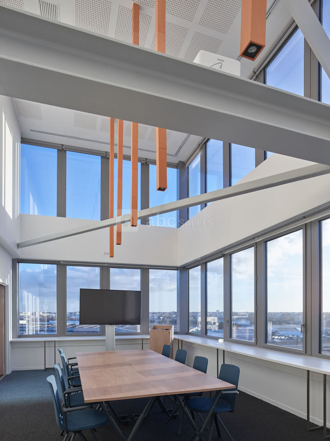- Au 8e étage, la salle de réunion modulable pour 14 et 16 personnes est équipée d’écrans, paperboard, tables et événement d’entreprise domine la ville à 30 mètres de haut